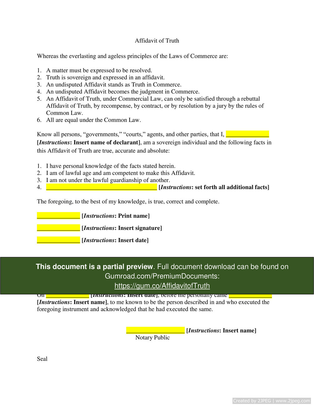 "This Affidavit of Truth allows an individual to declare that he or she is a sovereign individual, and therefore subject to common law principles. The affidavit represents a declaration of the individual's political and legal beliefs and disavows the legal authority of federal, state and municipal governments over him or her. This document allows the individual to set forth his or her declaration of facts and can be customized to include specific information.