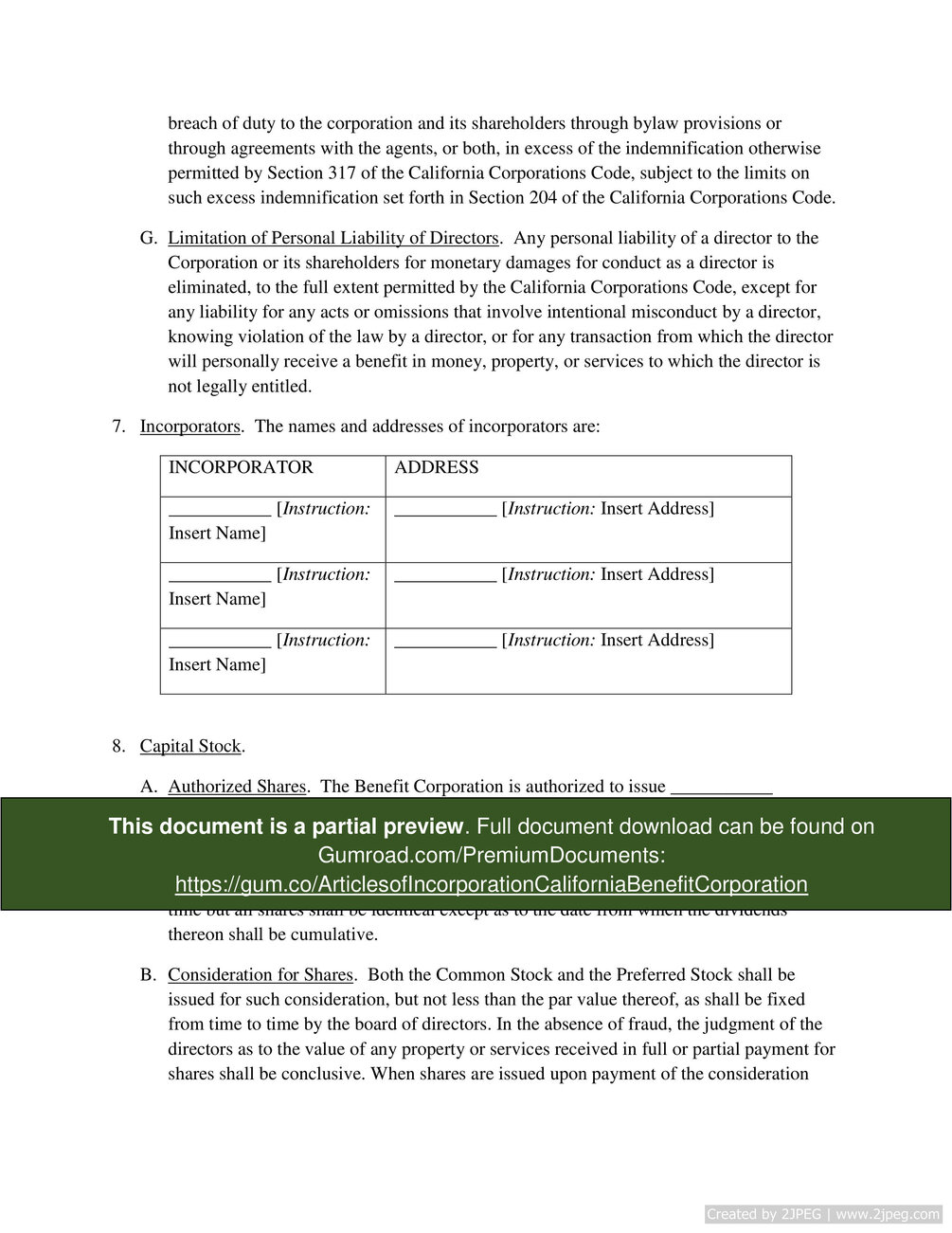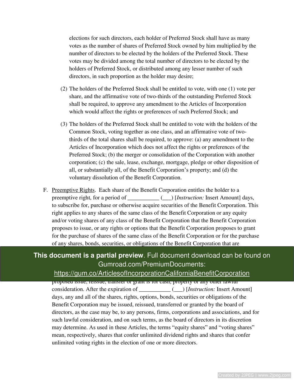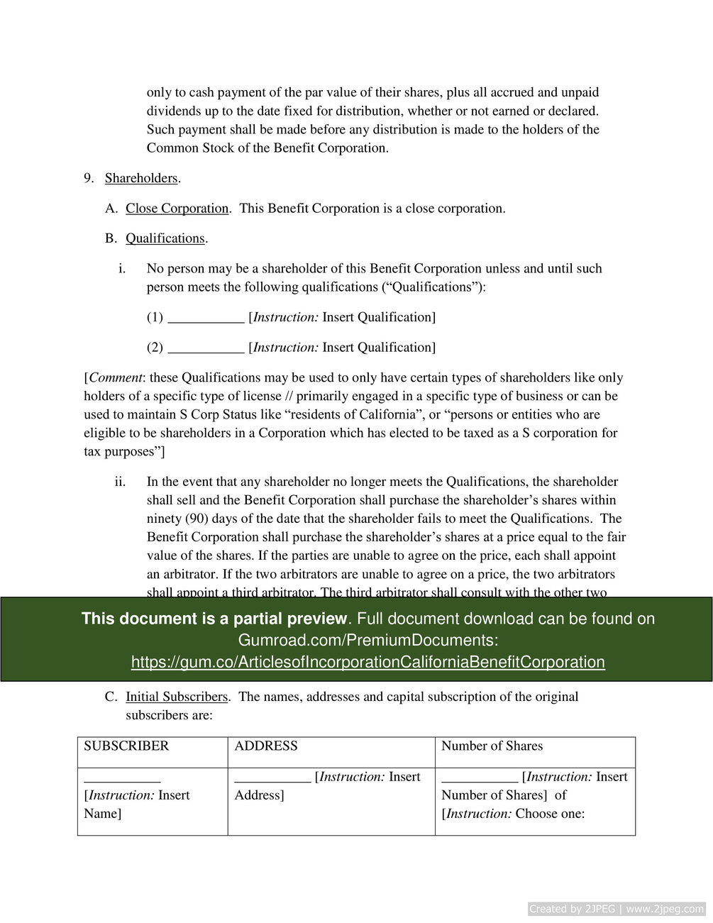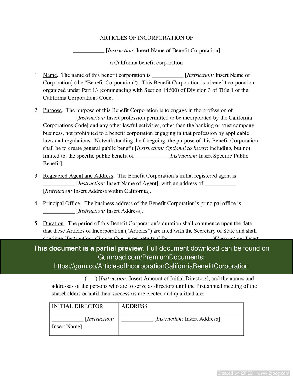 "This Articles of Incorporation of a California Benefit Corporation is to be filed with the Secretary of State, for the organization of a benefit corporation. The articles include the provisions required under the recently enacted law (i.e. paragraph 1-2), as well as a variety of optional provisions relating to the regulation of the affairs of the benefit corporation.