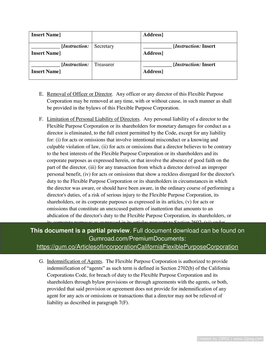 "This Articles of Incorporation of a California Flexible Purpose Corporation is to be filed with the Secretary of State, for the organization of a flexible purpose corporation. The articles include the provisions required under the recently enacted law (i.e. paragraph 1-4, and 9A-B), as well as a variety of optional provisions relating to the regulation of the affairs of the flexible purpose corporation.