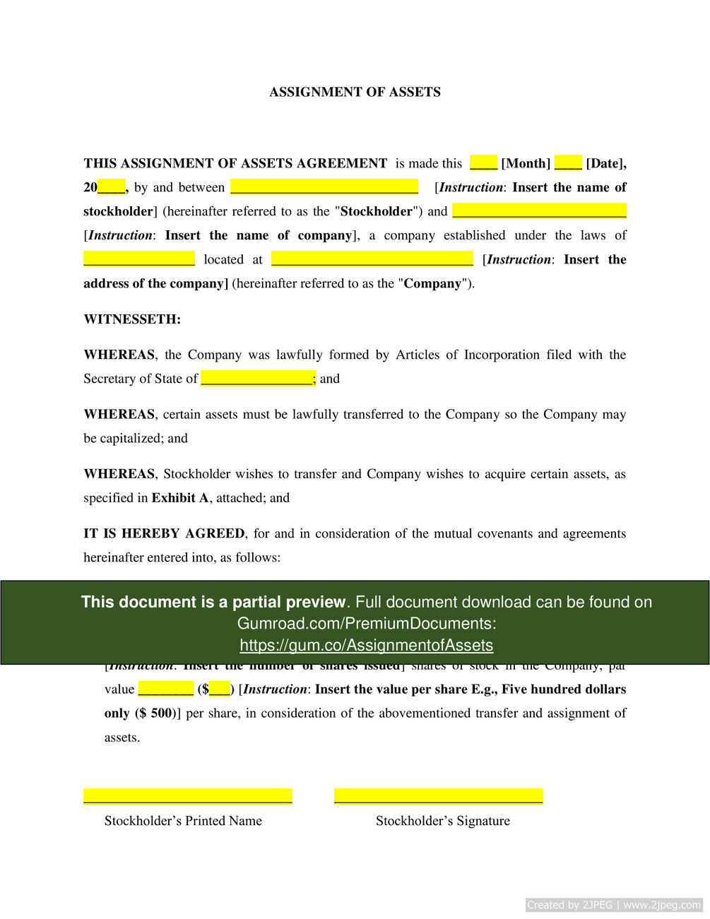 "This document is an agreement whereby the assignor assigns and transfers to assignee all of assignor's rights and interests in and to the described property and assets. As drafted, this agreement is between a stockholder who assigns his or her rights to specific assets and a company which issues shares to the assignor as consideration. This document is intended to contain standard clauses but the terms and provisions of this document can be modified to fit the needs of the drafting parties.