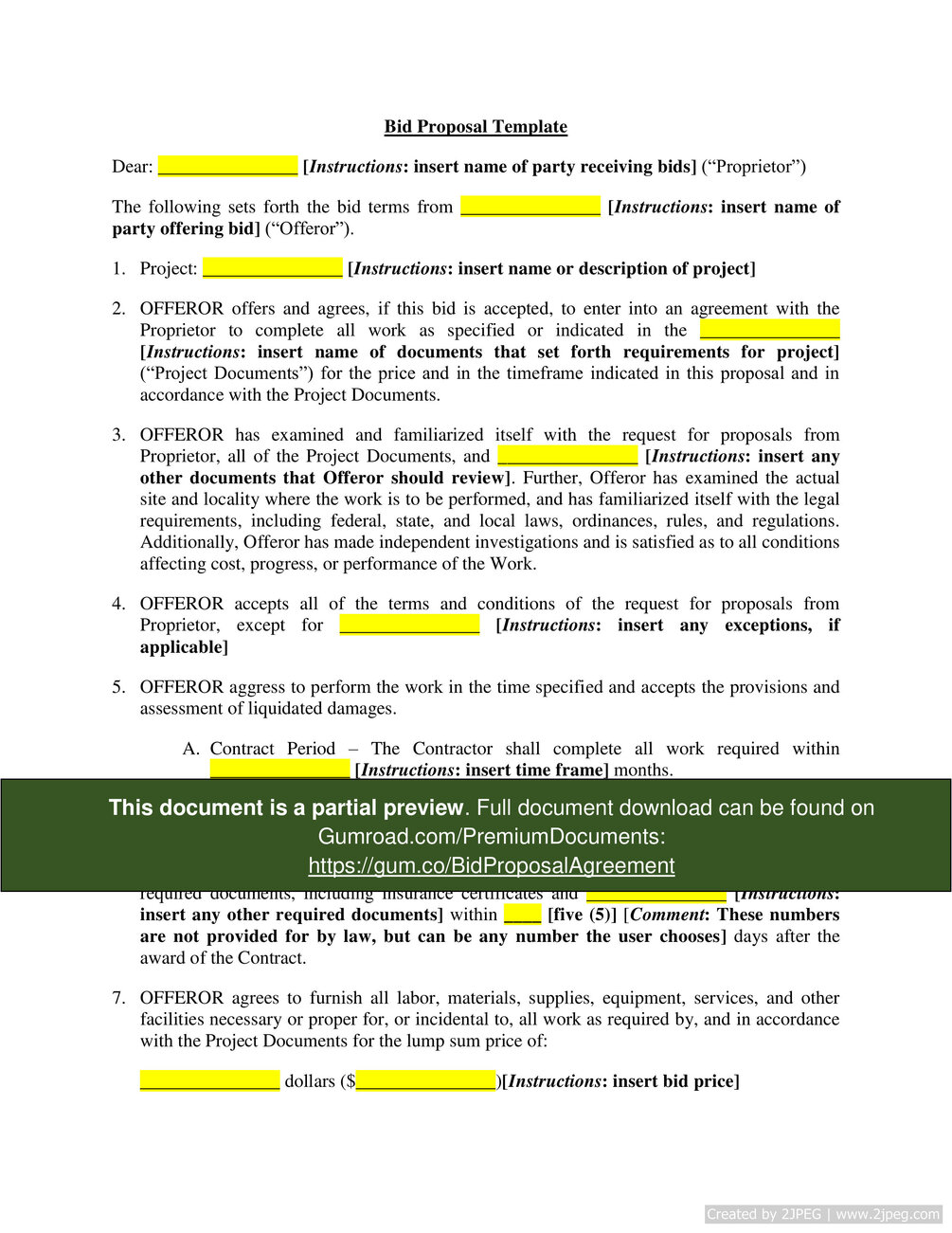 "This Bid Proposal Agreement is used when a contractor wants to place a bid to work on a construction project. A bid proposal is most often sent in response to a request for proposals or an invitation to bid from the project owner. This fully customizable document contains the material terms of the bid proposal including the contract price, completion time and any other provisions the contractor wishes to include. This form should be used by contractors when placing a bid for a construction project.