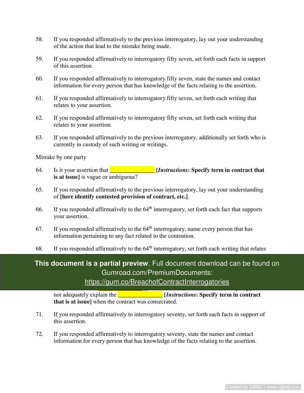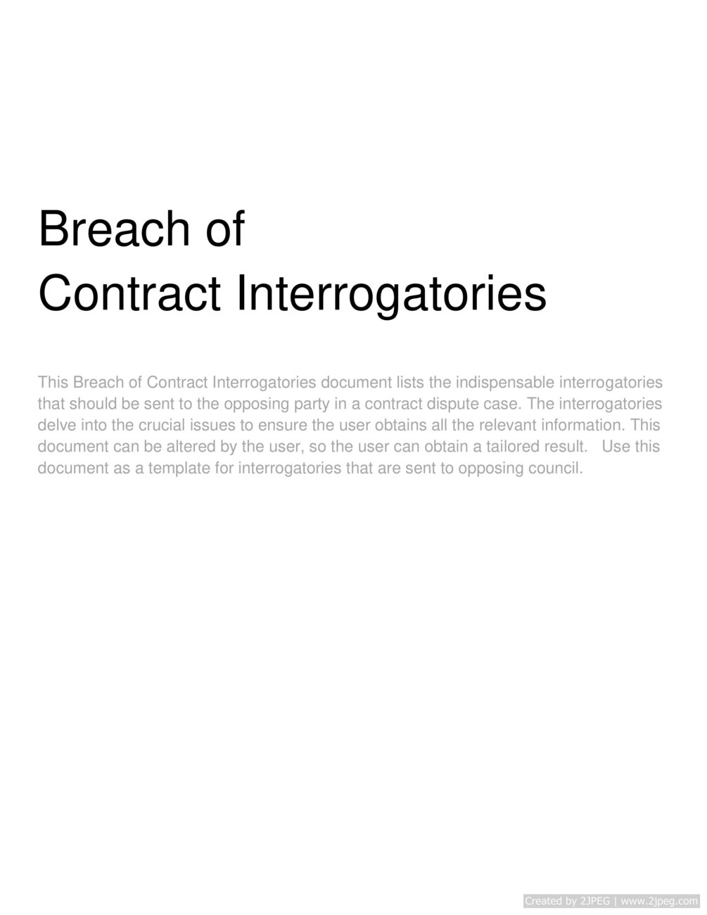 "This Breach of Contract Interrogatories document lists the indispensable interrogatories that should be sent to the opposing party in a contract dispute case. The interrogatories delve into the crucial issues to ensure the user obtains all the relevant information. This document can be altered by the user, so the user can obtain a tailored result. Use this document as a template for interrogatories that are sent to opposing council.