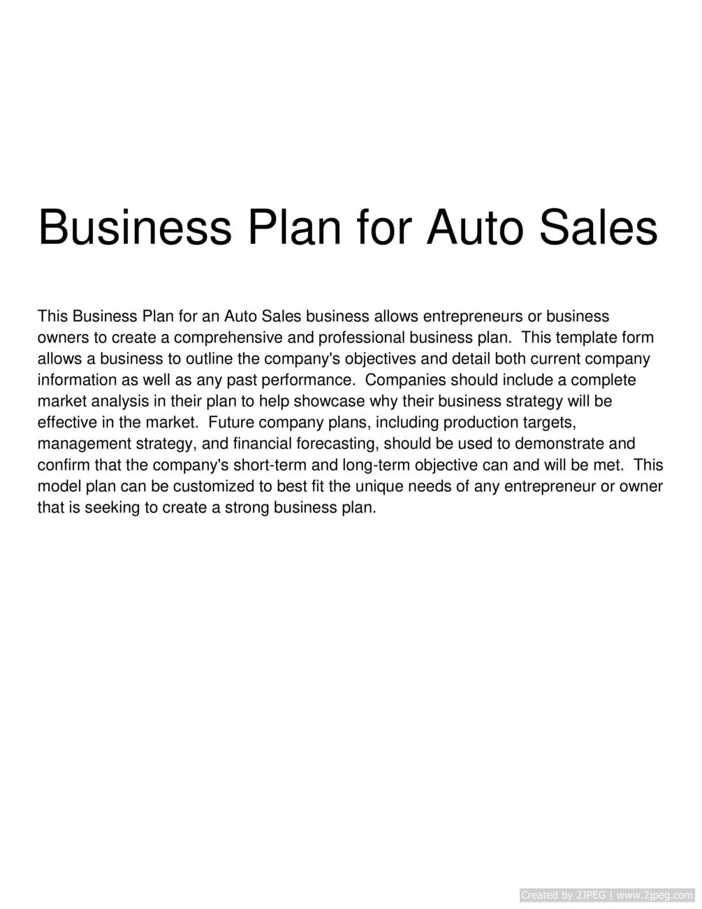 "This Business Plan for an Auto Sales business allows entrepreneurs or business owners to create a comprehensive and professional business plan. This template form allows a business to outline the company's objectives and detail both current company information as well as any past performance. Companies should include a complete market analysis in their plan to help showcase why their business strategy will be effective in the market. Future company plans, including production targets, management strategy, and financial forecasting, should be used to demonstrate and confirm that the company's short-term and long-term objective can and will be met. This model plan can be customized to best fit the unique needs of any entrepreneur or owner that is seeking to create a strong business plan.