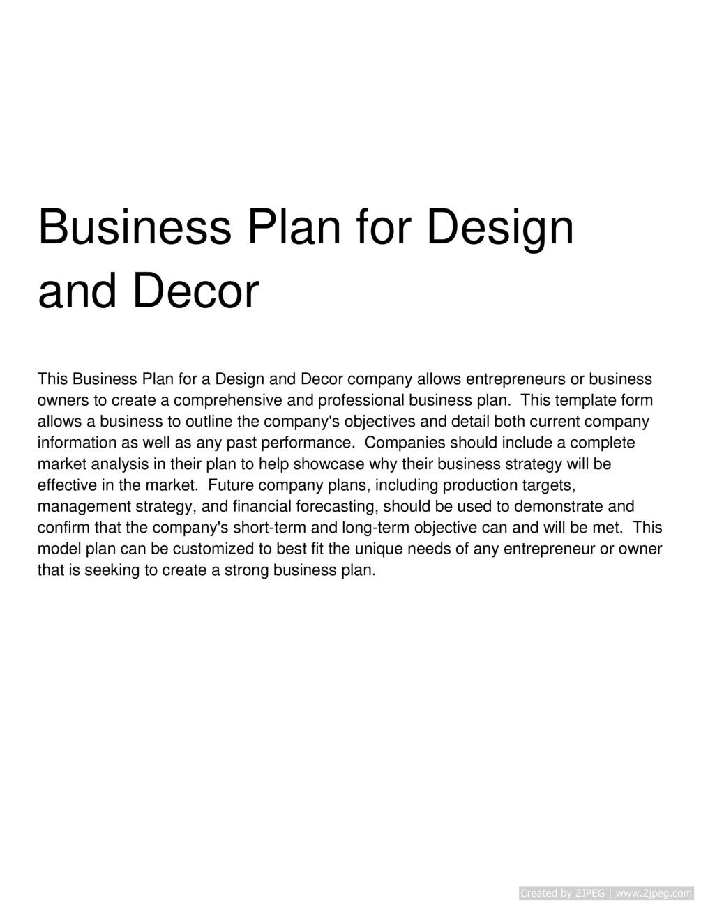 "This Business Plan for a Design and Decor company allows entrepreneurs or business owners to create a comprehensive and professional business plan. This template form allows a business to outline the company's objectives and detail both current company information as well as any past performance. Companies should include a complete market analysis in their plan to help showcase why their business strategy will be effective in the market. Future company plans, including production targets, management strategy, and financial forecasting, should be used to demonstrate and confirm that the company's short-term and long-term objective can and will be met. This model plan can be customized to best fit the unique needs of any entrepreneur or owner that is seeking to create a strong business plan.
