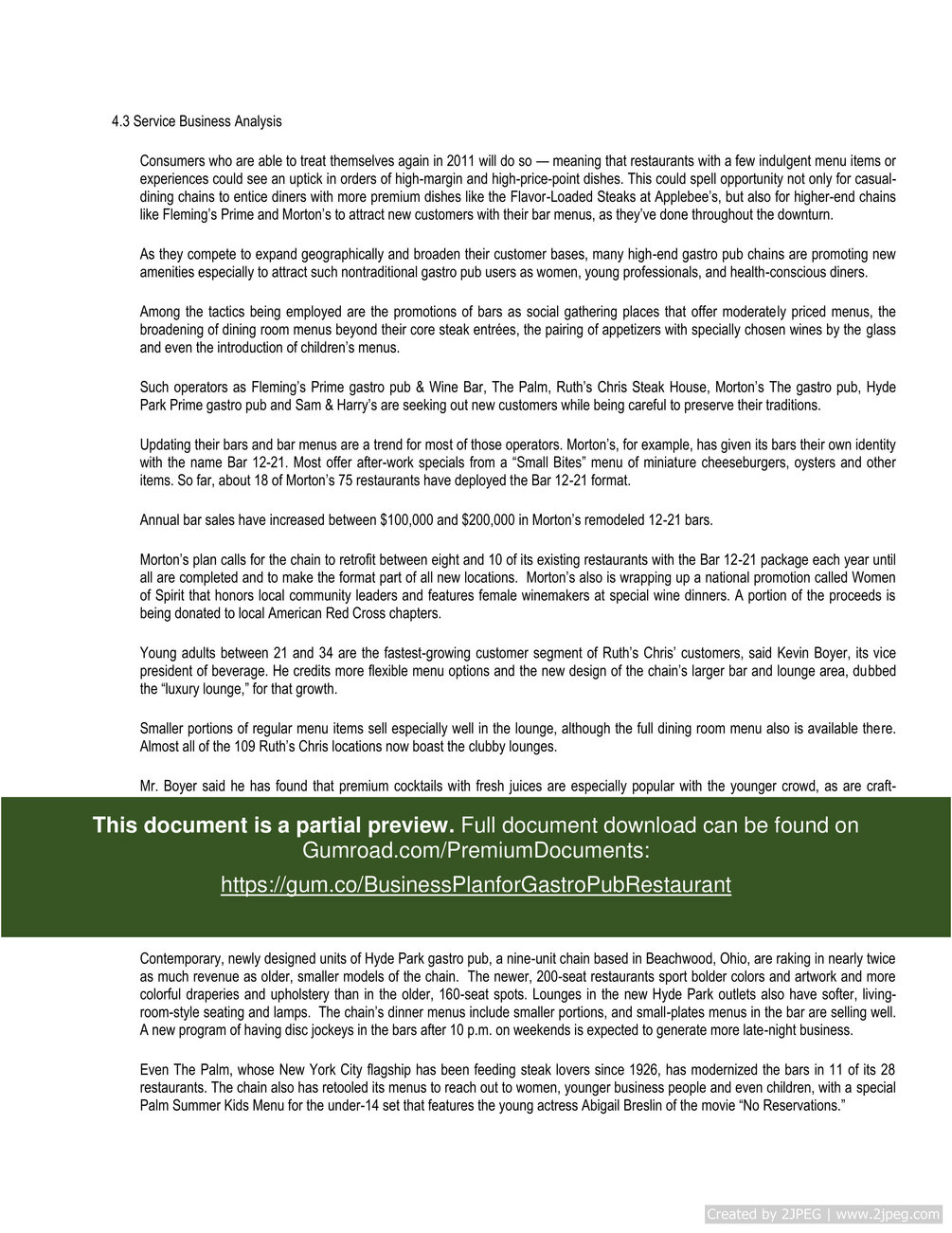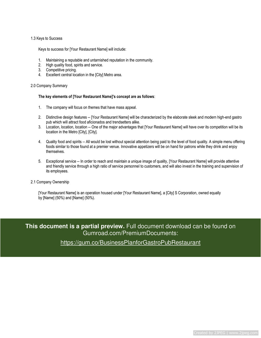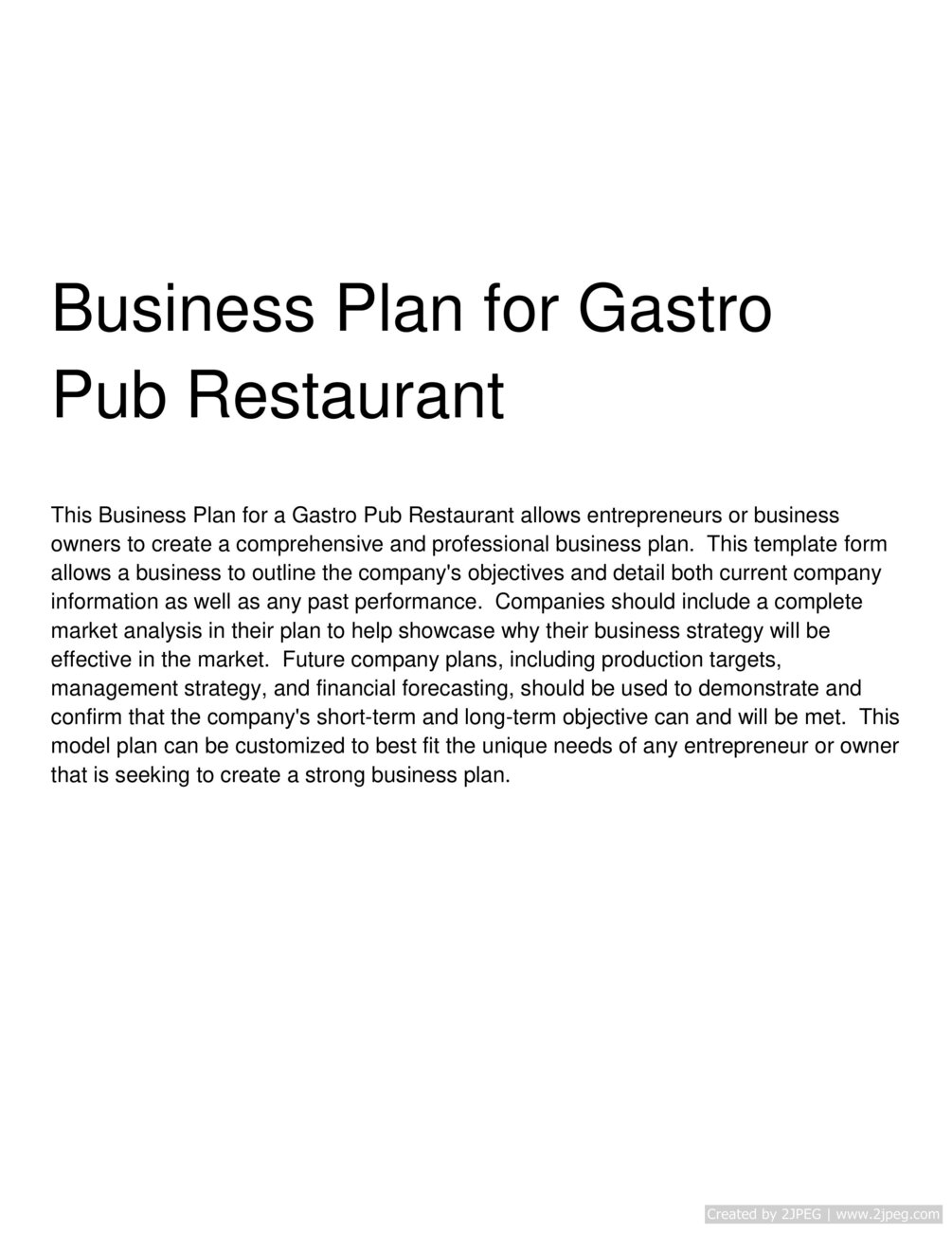 "This Business Plan for a Gastro Pub Restaurant allows entrepreneurs or business owners to create a comprehensive and professional business plan. This template form allows a business to outline the company's objectives and detail both current company information as well as any past performance. Companies should include a complete market analysis in their plan to help showcase why their business strategy will be effective in the market. Future company plans, including production targets, management strategy, and financial forecasting, should be used to demonstrate and confirm that the company's short-term and long-term objective can and will be met. This model plan can be customized to best fit the unique needs of any entrepreneur or owner that is seeking to create a strong business plan.