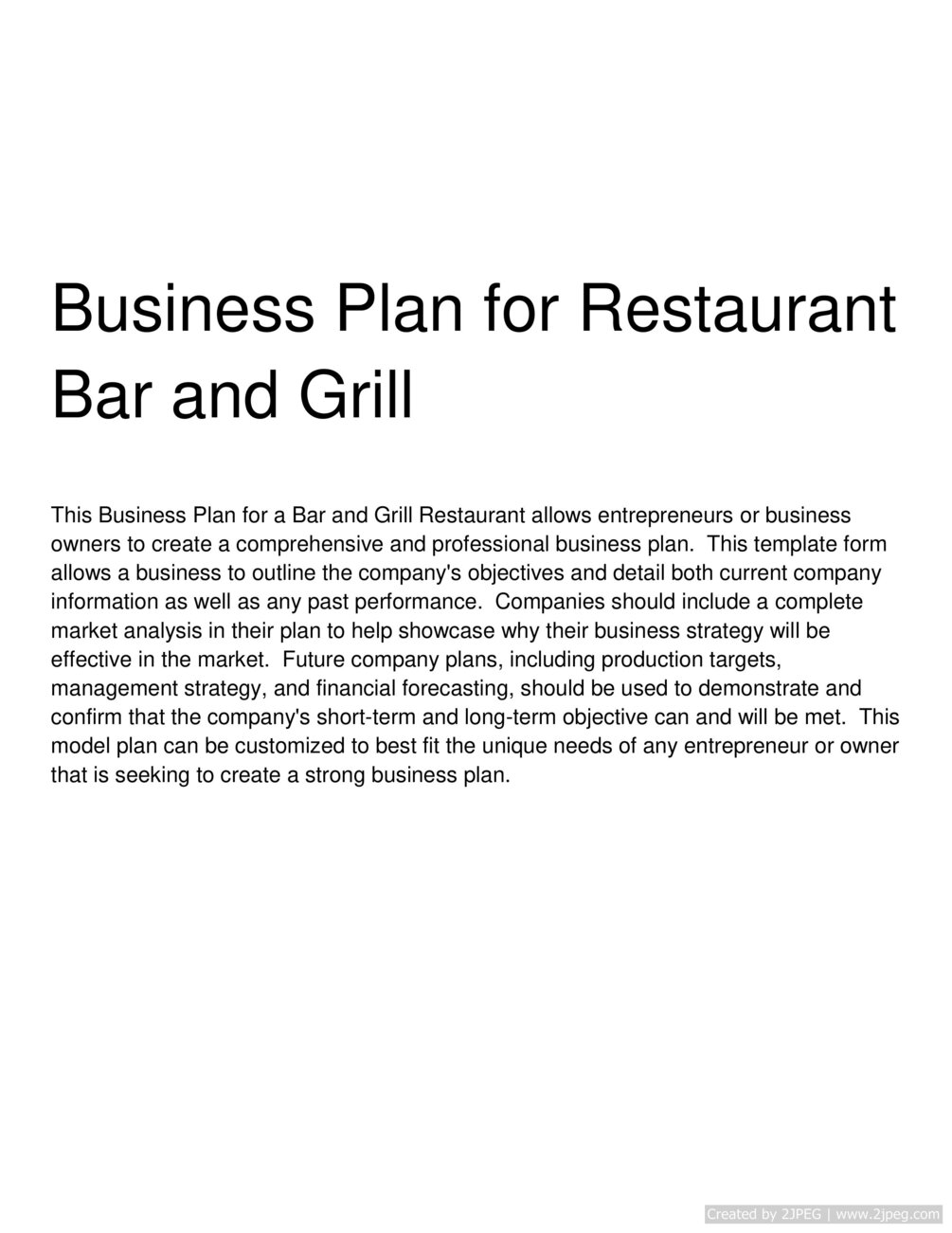 "This Business Plan for a Bar and Grill Restaurant allows entrepreneurs or business owners to create a comprehensive and professional business plan. This template form allows a business to outline the company's objectives and detail both current company information as well as any past performance. Companies should include a complete market analysis in their plan to help showcase why their business strategy will be effective in the market. Future company plans, including production targets, management strategy, and financial forecasting, should be used to demonstrate and confirm that the company's short-term and long-term objective can and will be met. This model plan can be customized to best fit the unique needs of any entrepreneur or owner that is seeking to create a strong business plan.
