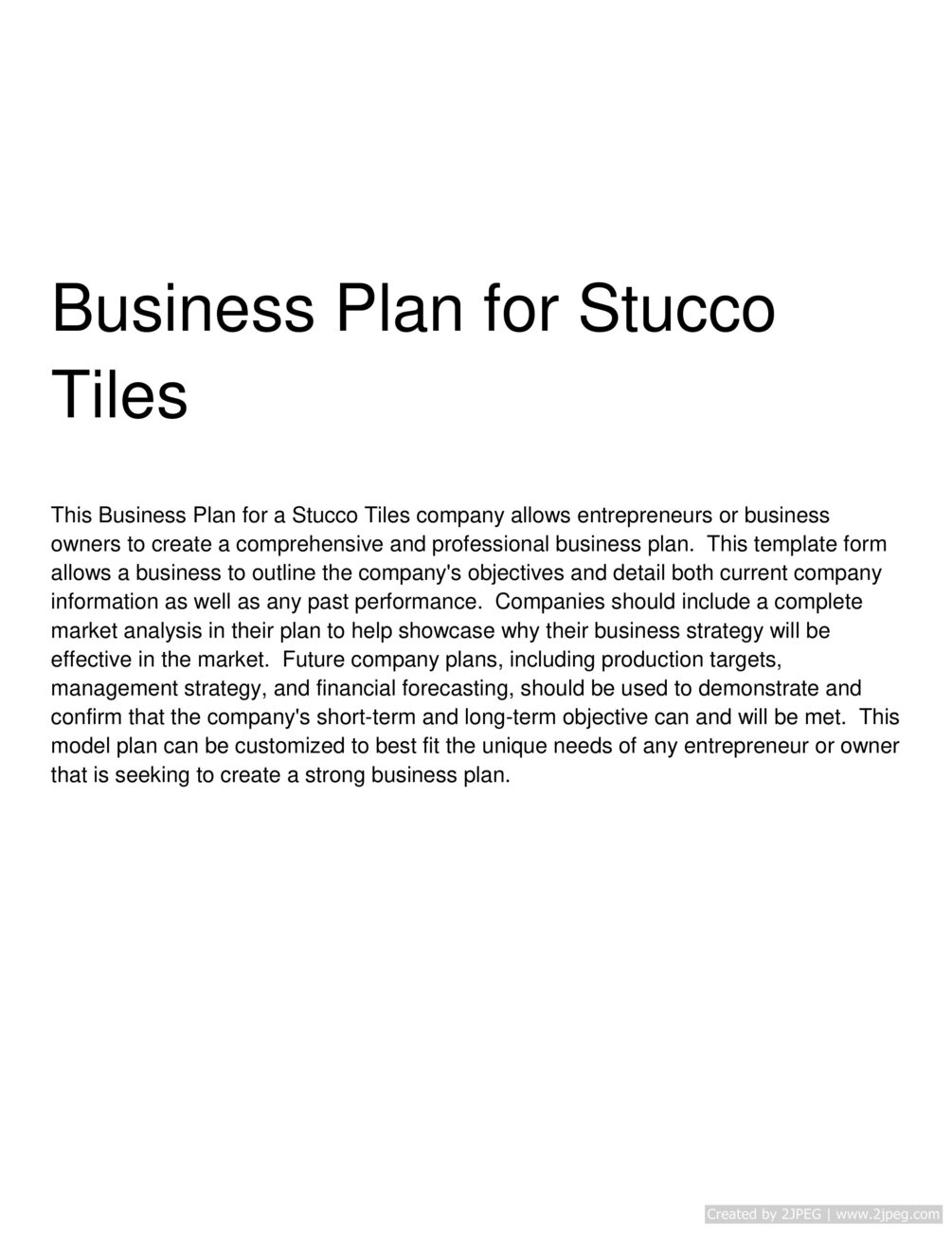 "This Business Plan for a Stucco Tiles company allows entrepreneurs or business owners to create a comprehensive and professional business plan. This template form allows a business to outline the company's objectives and detail both current company information as well as any past performance. Companies should include a complete market analysis in their plan to help showcase why their business strategy will be effective in the market. Future company plans, including production targets, management strategy, and financial forecasting, should be used to demonstrate and confirm that the company's short-term and long-term objective can and will be met. This model plan can be customized to best fit the unique needs of any entrepreneur or owner that is seeking to create a strong business plan.