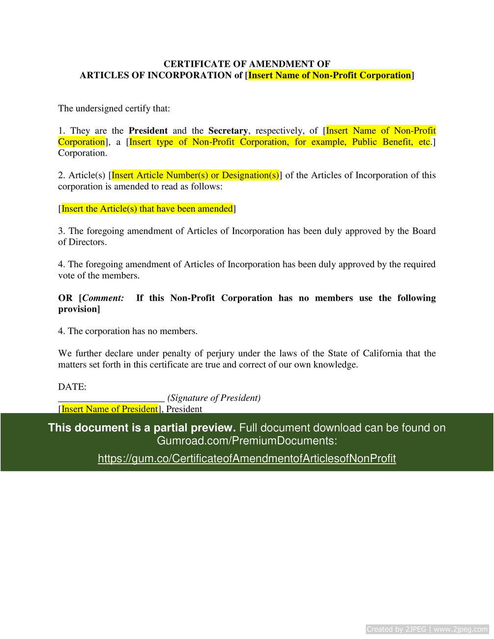 Download here: https://gum.co/CertificateofAmendmentofArticlesofNonProfit
