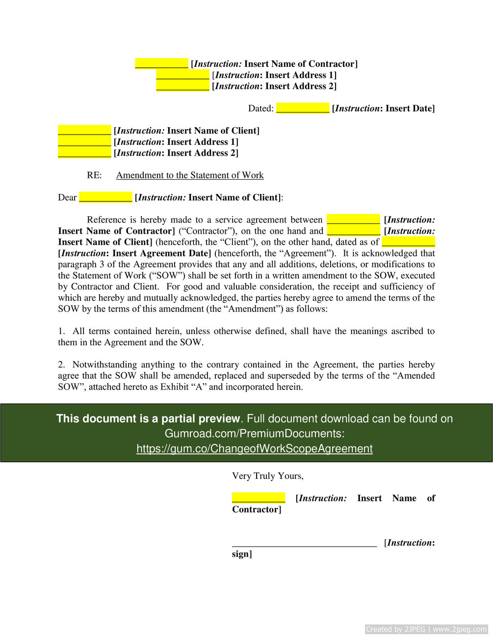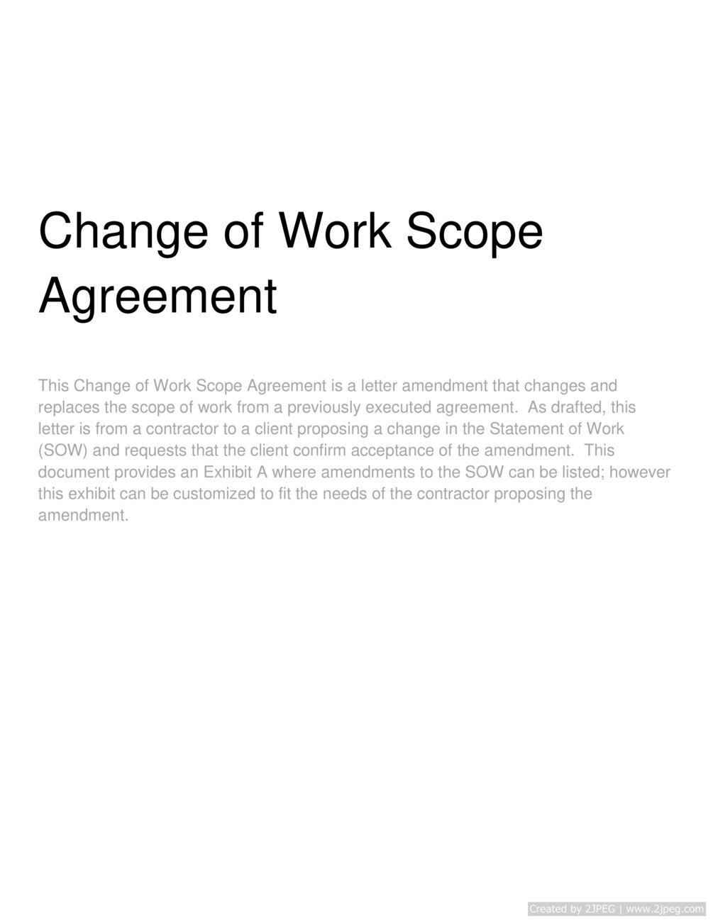 "This Change of Work Scope Agreement is a letter amendment that changes and replaces the scope of work from a previously executed agreement. As drafted, this letter is from a contractor to a client proposing a change in the Statement of Work (SOW) and requests that the client confirm acceptance of the amendment. This document provides an Exhibit A where amendments to the SOW can be listed; however this exhibit can be customized to fit the needs of the contractor proposing the amendment.