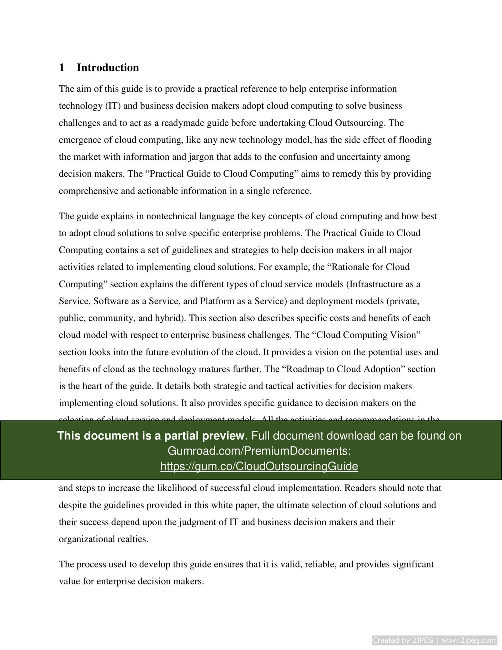 "The aim of this guide is to provide a practical reference to help enterprise information technology (IT) and business decision makers adopt cloud computing to solve business challenges. This guide includes everything needed to plan for deployment models, a roadmap of Outsourcing, and the Keys to Successful Cloud Outsourcing.