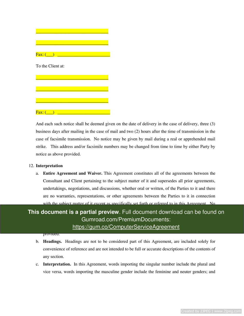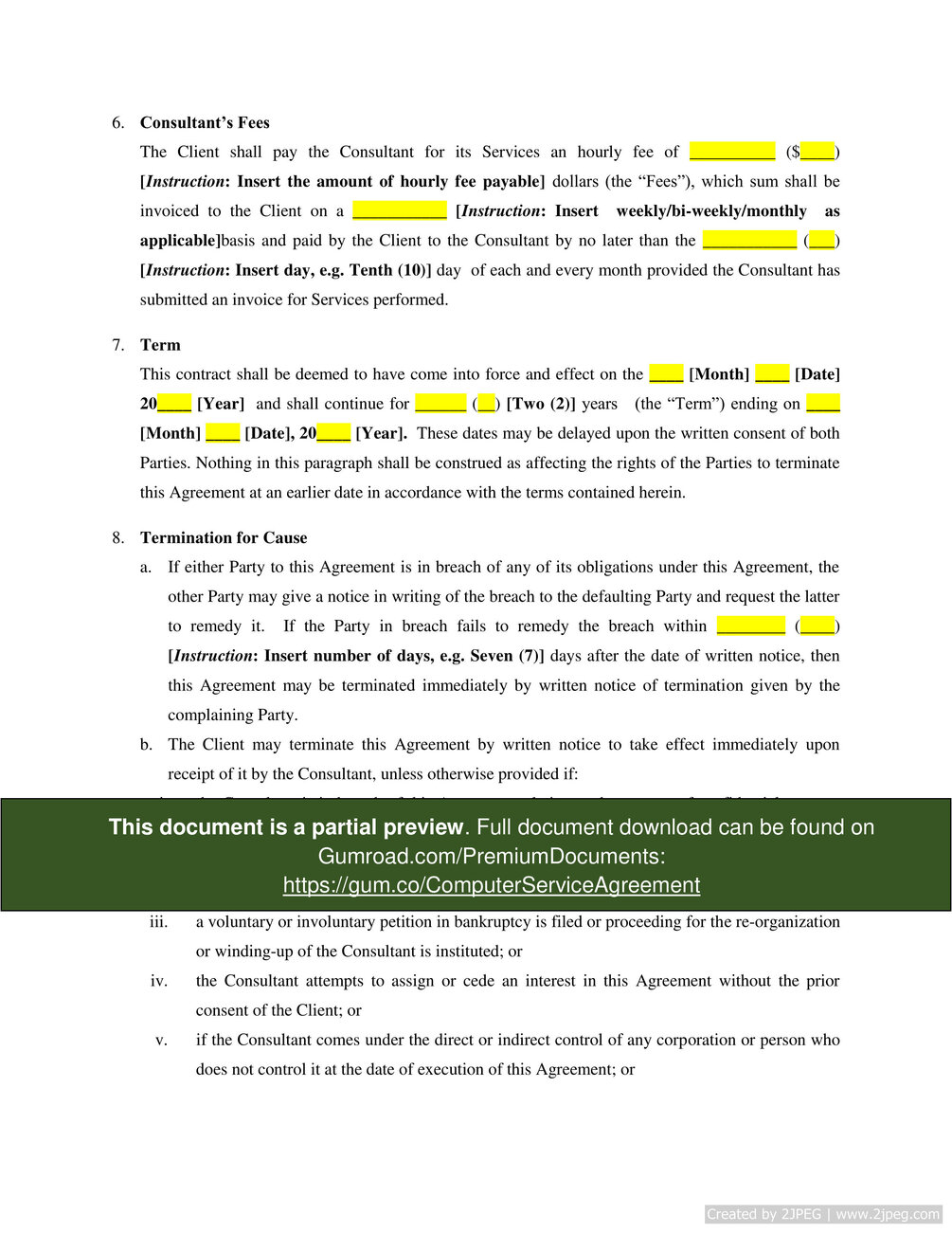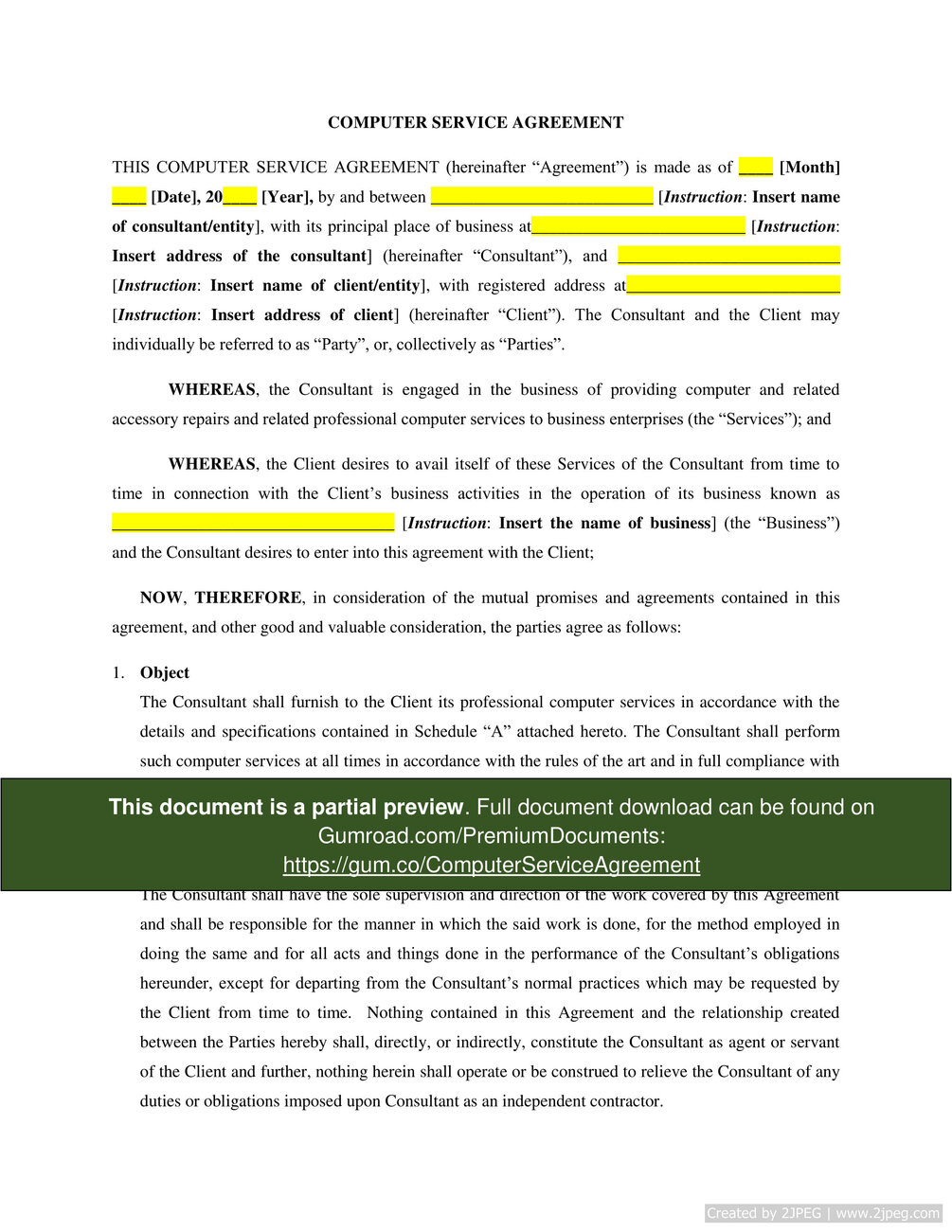 "This Computer Service Agreement is made between a computer consultant and a client, whereby the client uses the computer services of the consultant. The agreement provides for an hourly fee to be paid to the consultant for the services provided. Some additional features that are covered in this agreement are Comprehensive General Liability Insurance and a 'Time is of the Essence' clause which creates a rigid deadline for the work to be completed by. It contains numerous standard provisions as well as opportunities for customization to fit the specific needs of the parties. This document should be used by small businesses or other entities that want to hire a computer consultant to service or repair computers.