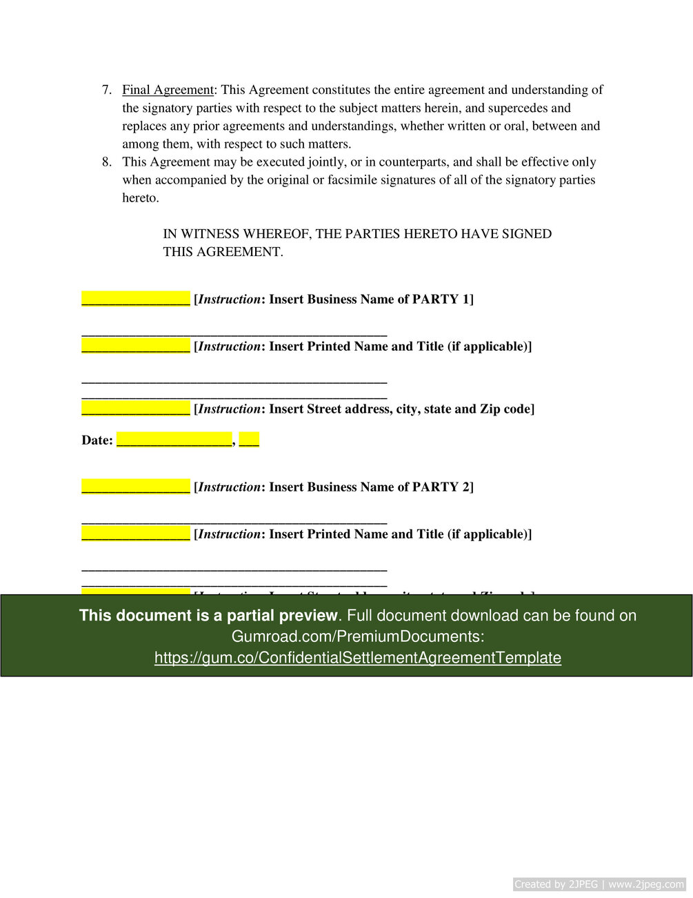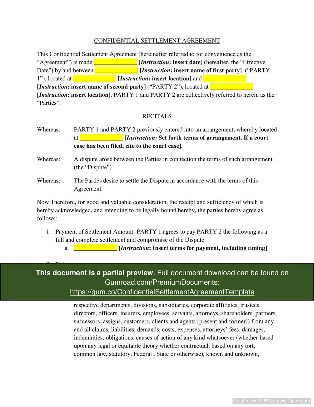 "This is a template that can be used to foster the terms of a settlement when a settlement has been reached by the parties of a lawsuit. This template includes the settlement amount, a release providing that the settling party will be discharged and acquitted, and which state law will govern. Additionally, this document provides that the settlement terms will remain confidential. This template should be used by individuals or entities that have reached a settlement to a claim or pending lawsuit to memorialize the terms and maintain confidentiality.