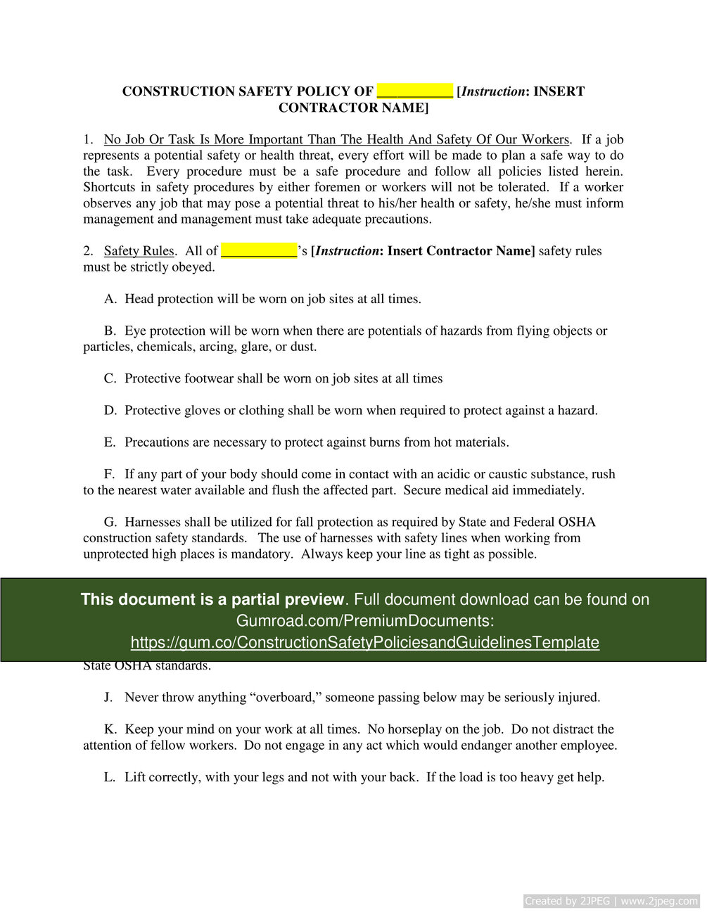 Construction Safety Policies and Guidelines Template