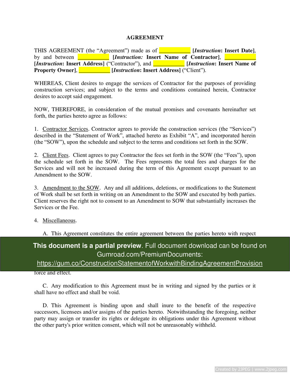 "This Construction Statement of Work with Binding Agreement Provision is a short agreement which states that the contractor agrees to provide the services described in the Statement of Work, and that the Client agrees to pay the fees set forth in the Statement of Work. The Statement of Work includes a general summary of the project, specific requirements, deliverables, timetable for delivery, exclusions, fees, fee schedule with room for additional project notes. This Agreement contains standard language used in this type of agreement, however, additional language may be added to suit the needs of the contracting parties.