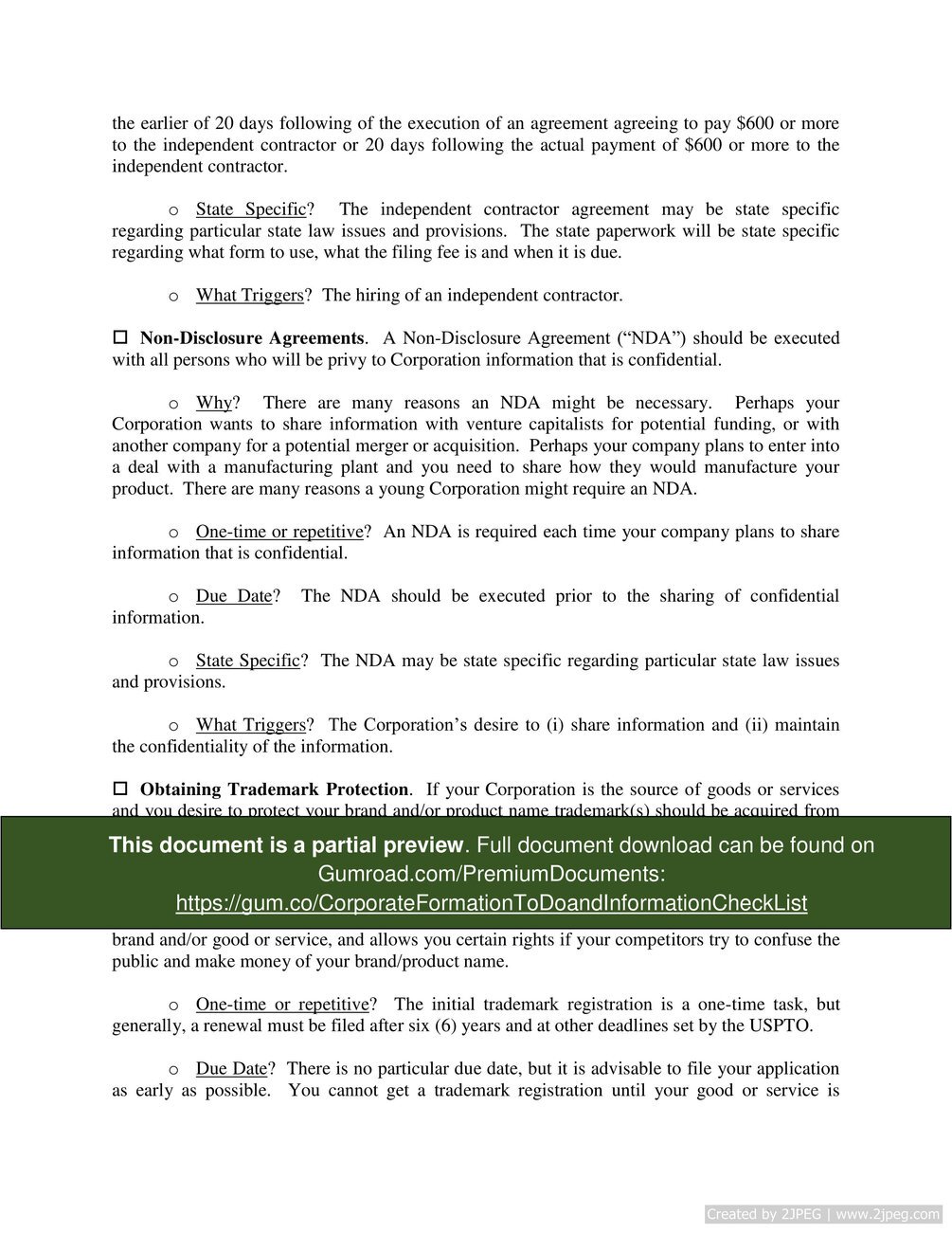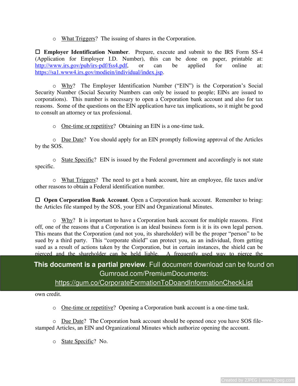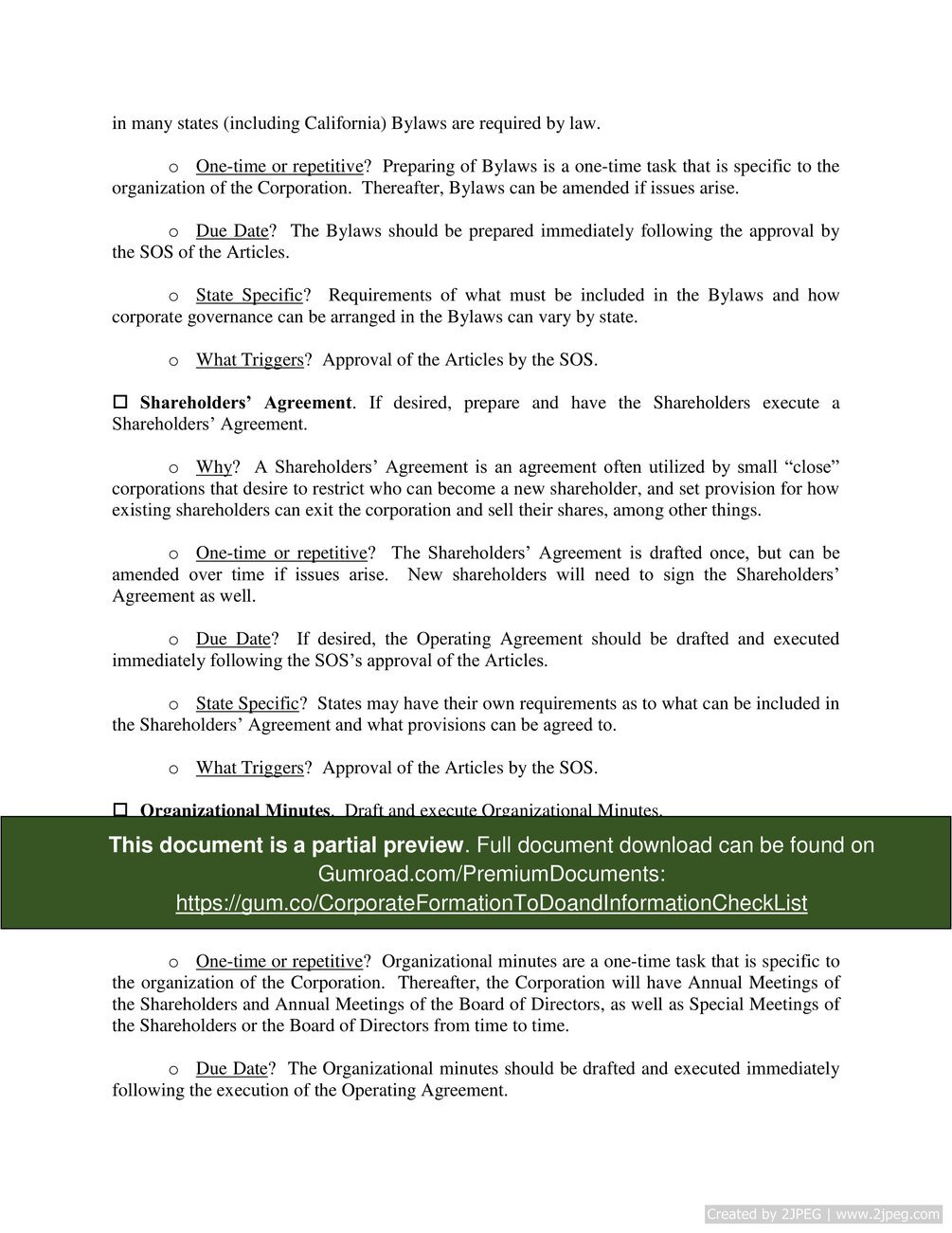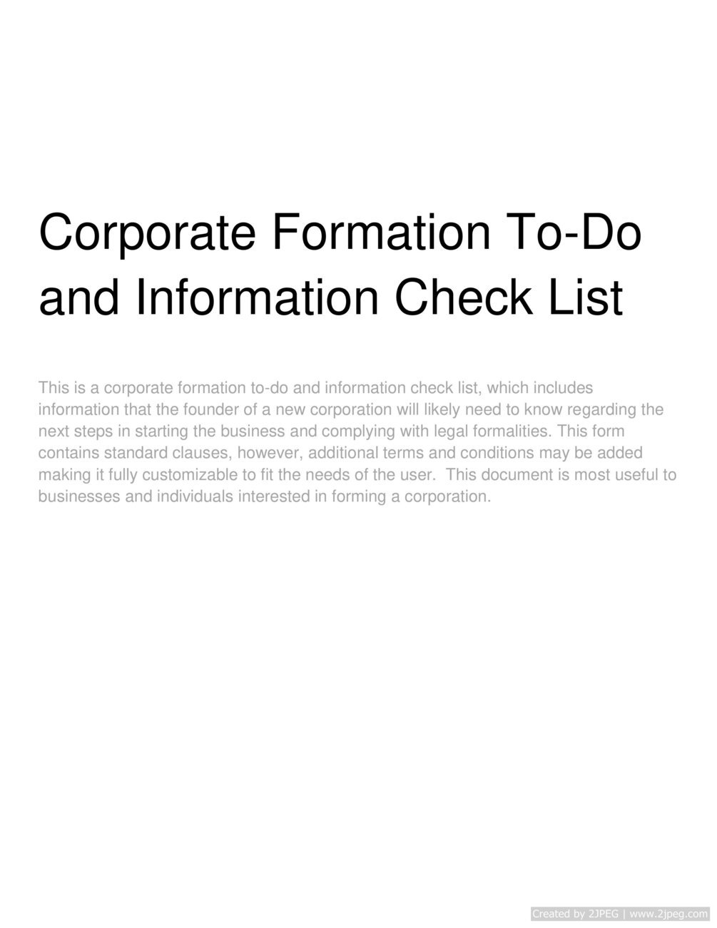 Corporate Formation To-Do and Information Check List