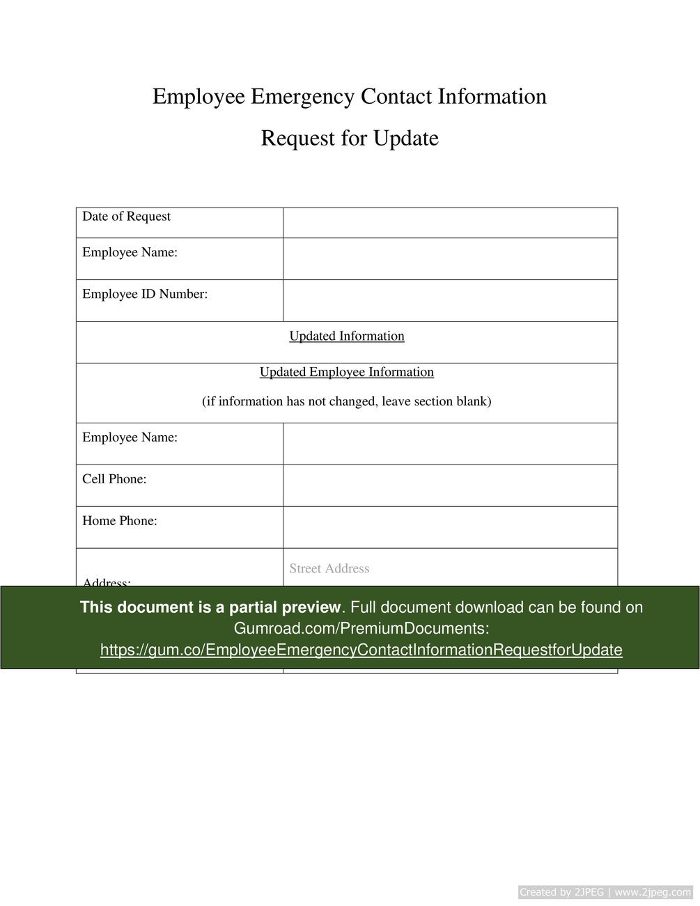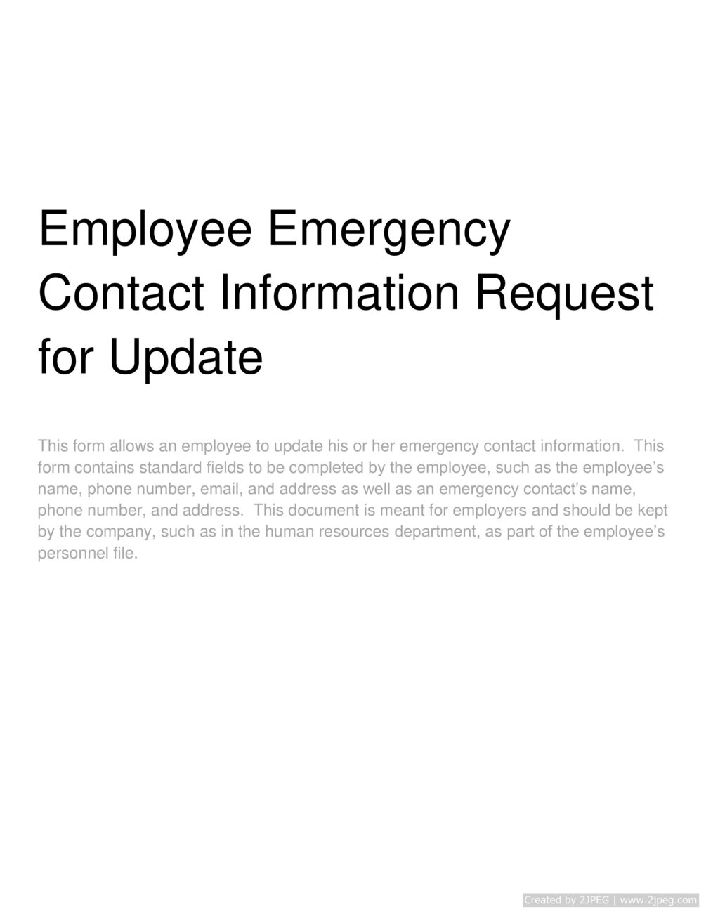 "This form allows an employee to update his or her emergency contact information. This form contains standard fields to be completed by the employee, such as the employee's name, phone number, email, and address as well as an emergency contact's name, phone number, and address. This document is meant for employers and should be kept by the company, such as in the human resources department, as part of the employee's personnel file.