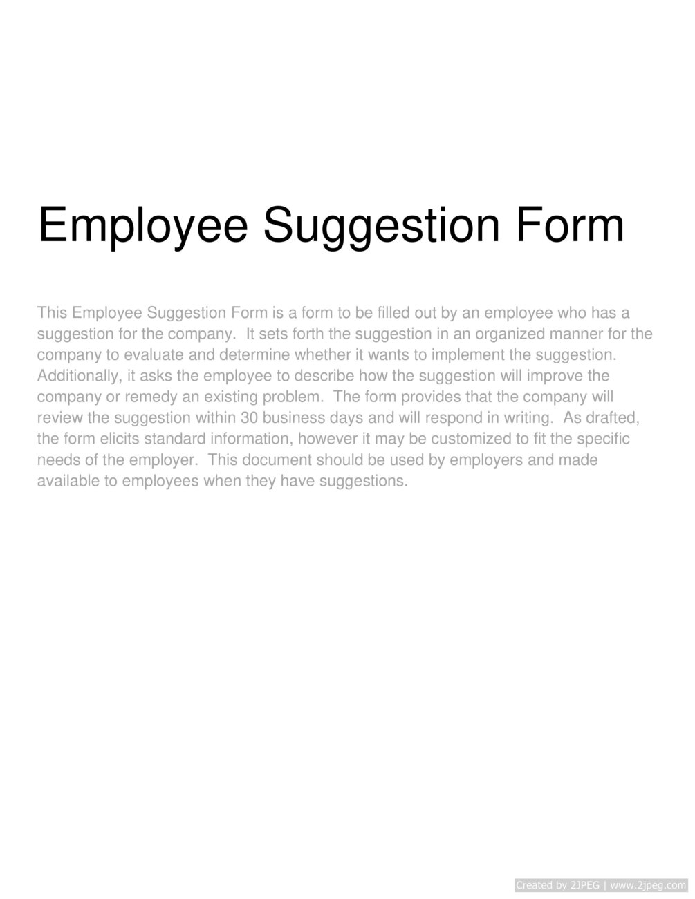 "This Employee Suggestion Form is a form to be filled out by an employee who has a suggestion for the company. It sets forth the suggestion in an organized manner for the company to evaluate and determine whether it wants to implement the suggestion. Additionally, it asks the employee to describe how the suggestion will improve the company or remedy an existing problem. The form provides that the company will review the suggestion within 30 business days and will respond in writing. As drafted, the form elicits standard information, however it may be customized to fit the specific needs of the employer. This document should be used by employers and made available to employees when they have suggestions.