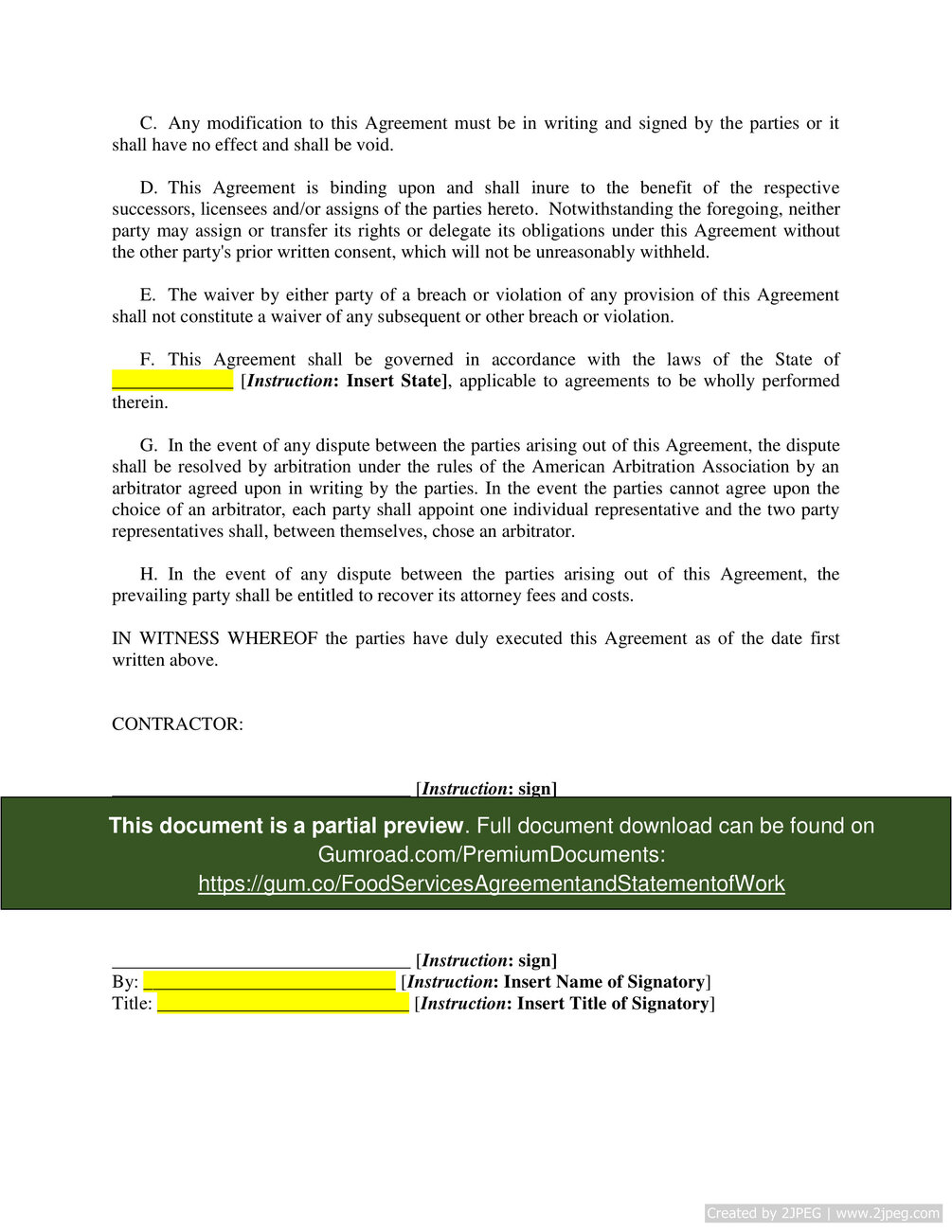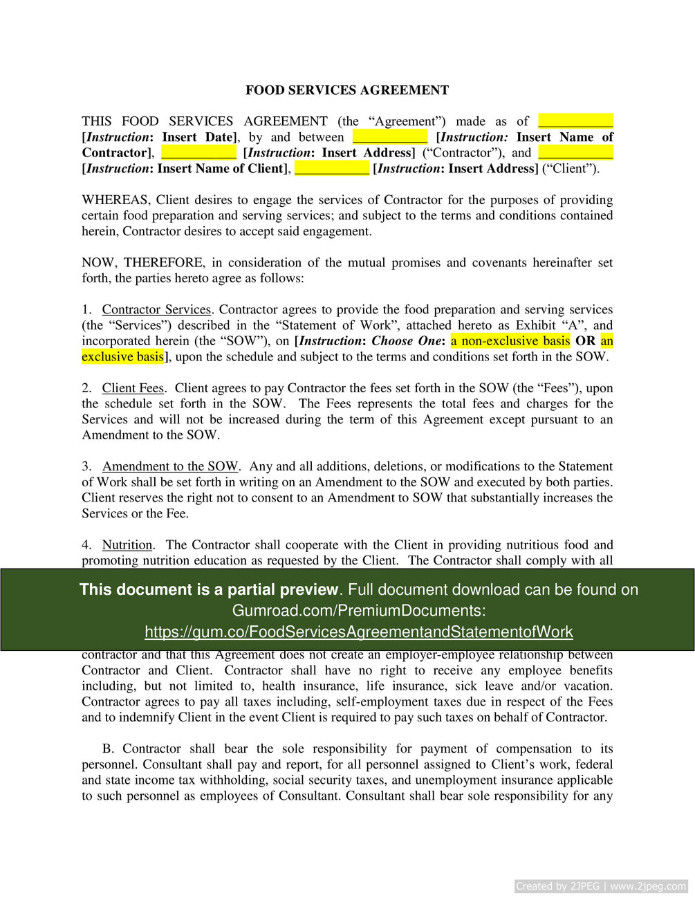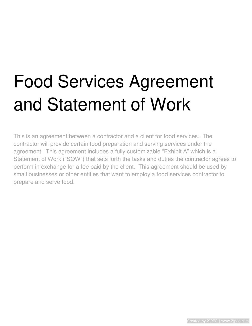 "This is an agreement between a contractor and a client for food services. The contractor will provide certain food preparation and serving services under the agreement. This agreement includes a fully customizable 'Exhibit A' which is a Statement of Work ('SOW') that sets forth the tasks and duties the contractor agrees to perform in exchange for a fee paid by the client. This agreement should be used by small businesses or other entities that want to employ a food services contractor to prepare and serve food.