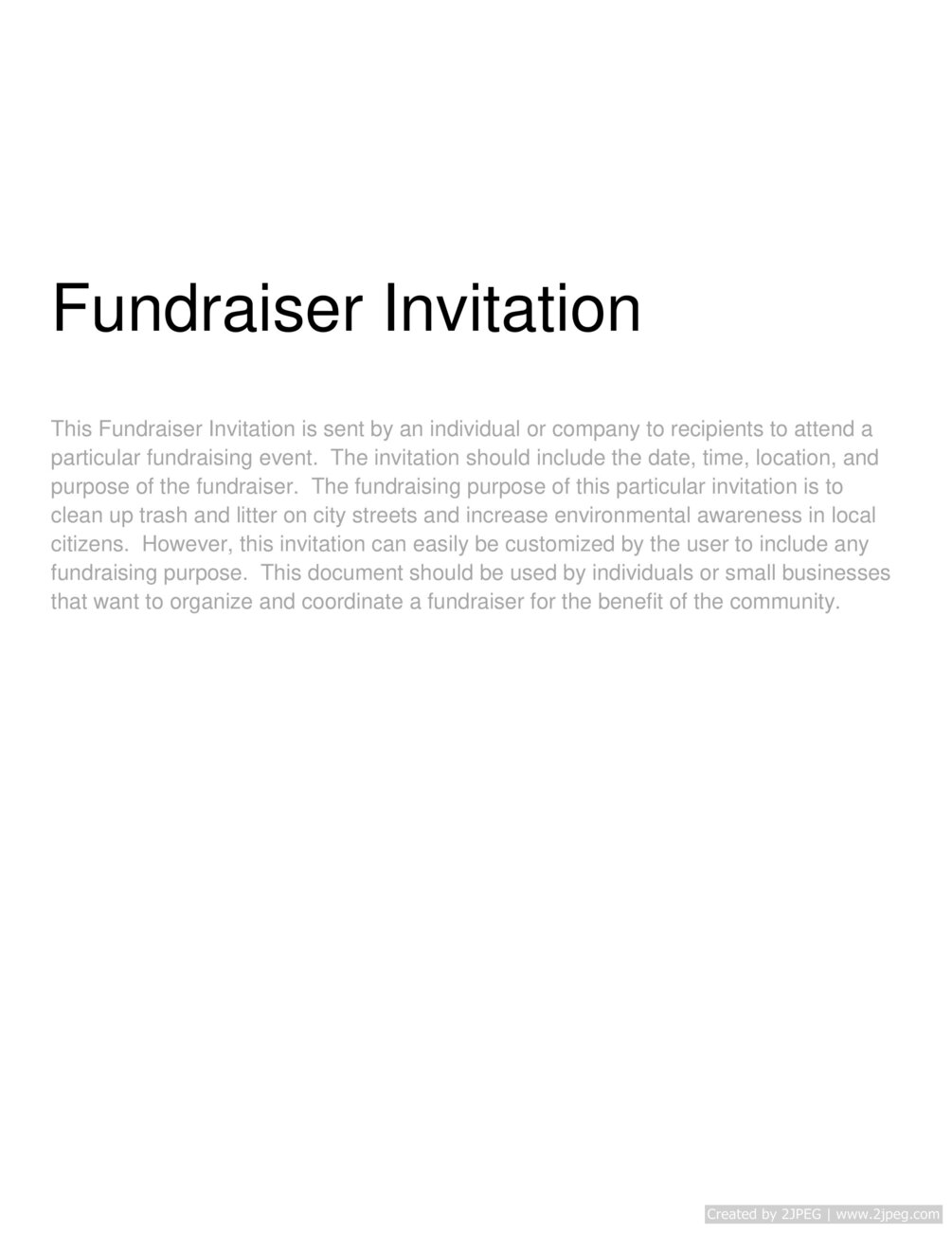 "This Fundraiser Invitation is sent by an individual or company to recipients to attend a particular fundraising event. The invitation should include the date, time, location, and purpose of the fundraiser. The fundraising purpose of this particular invitation is to clean up trash and litter on city streets and increase environmental awareness in local citizens. However, this invitation can easily be customized by the user to include any fundraising purpose. This document should be used by individuals or small businesses that want to organize and coordinate a fundraiser for the benefit of the community.