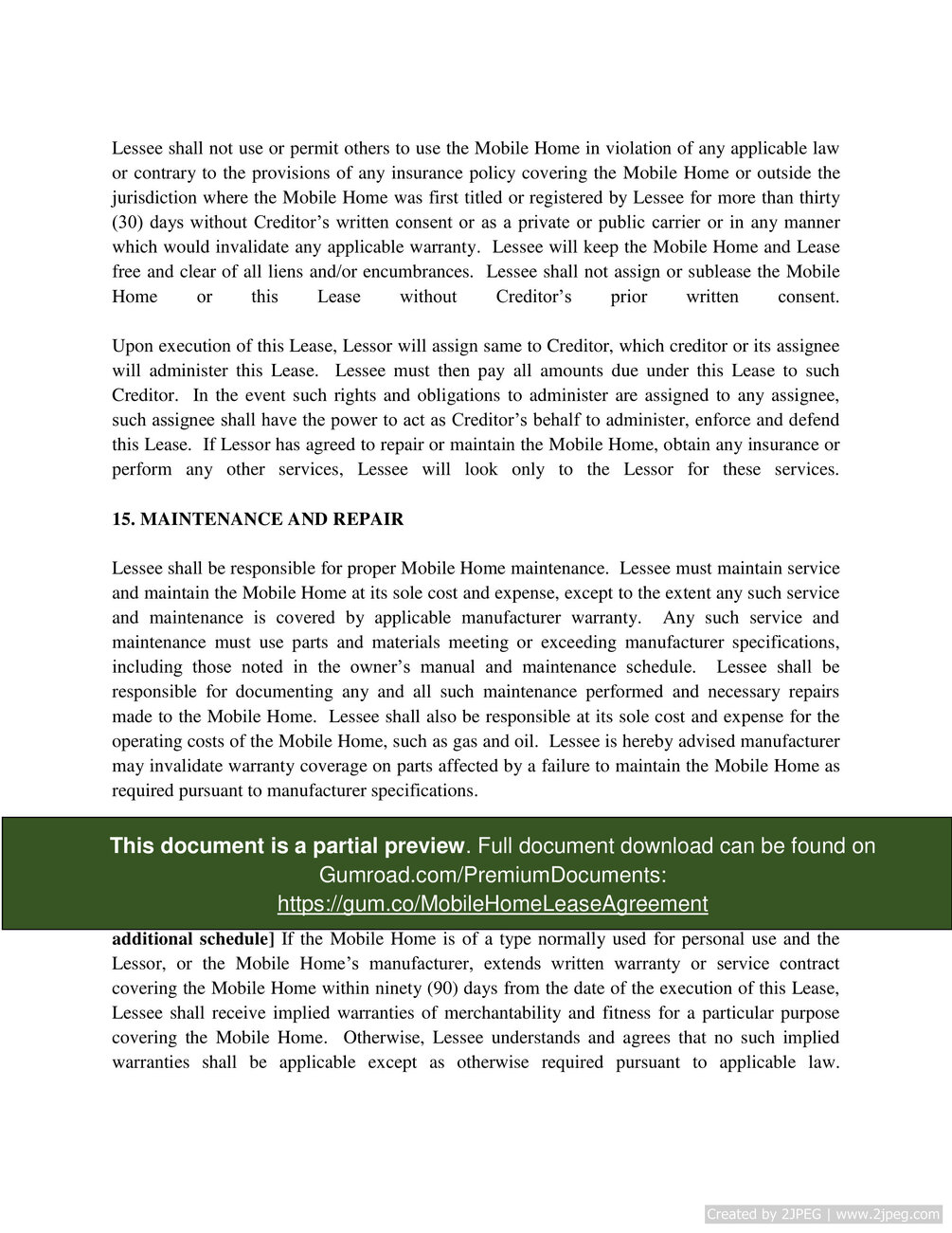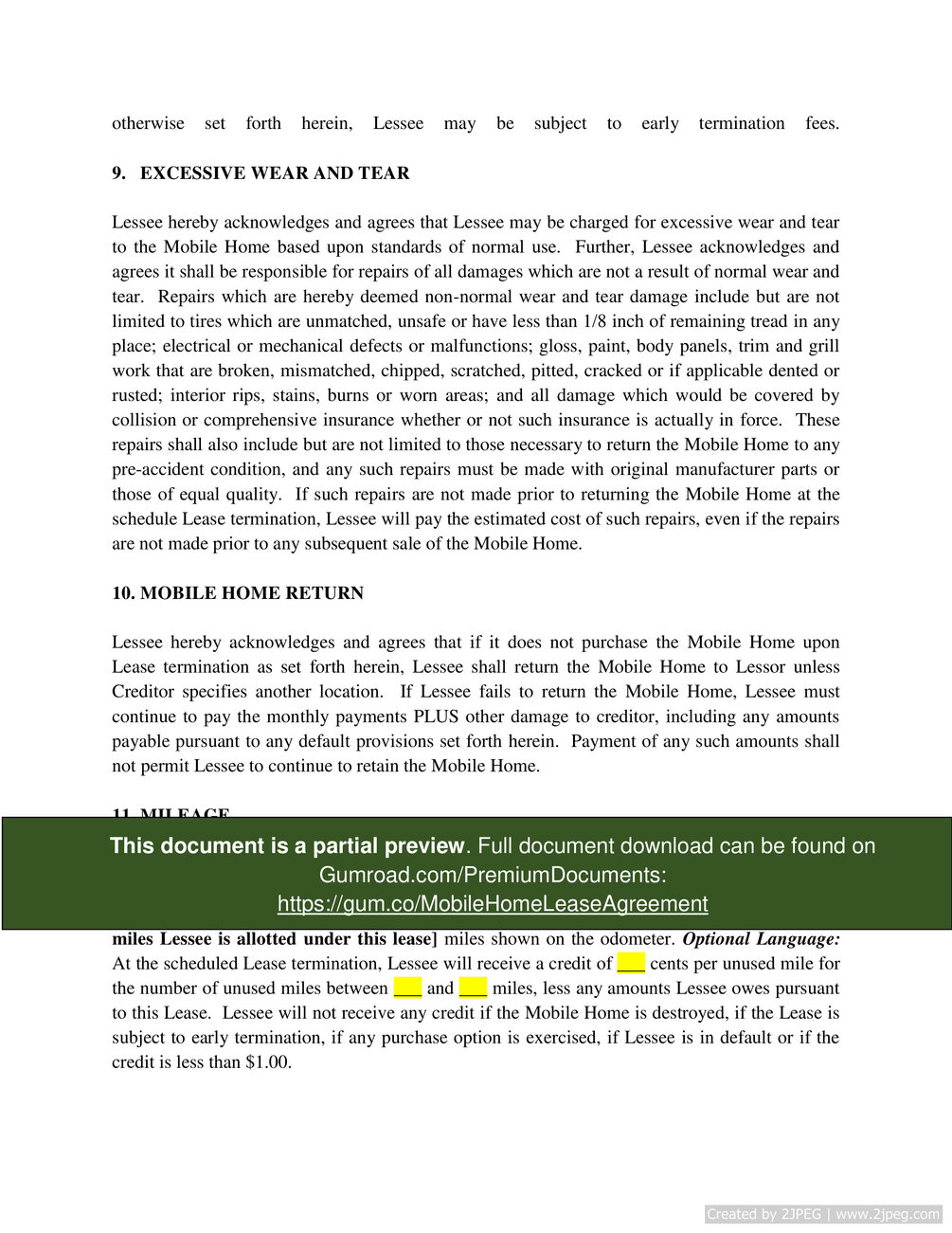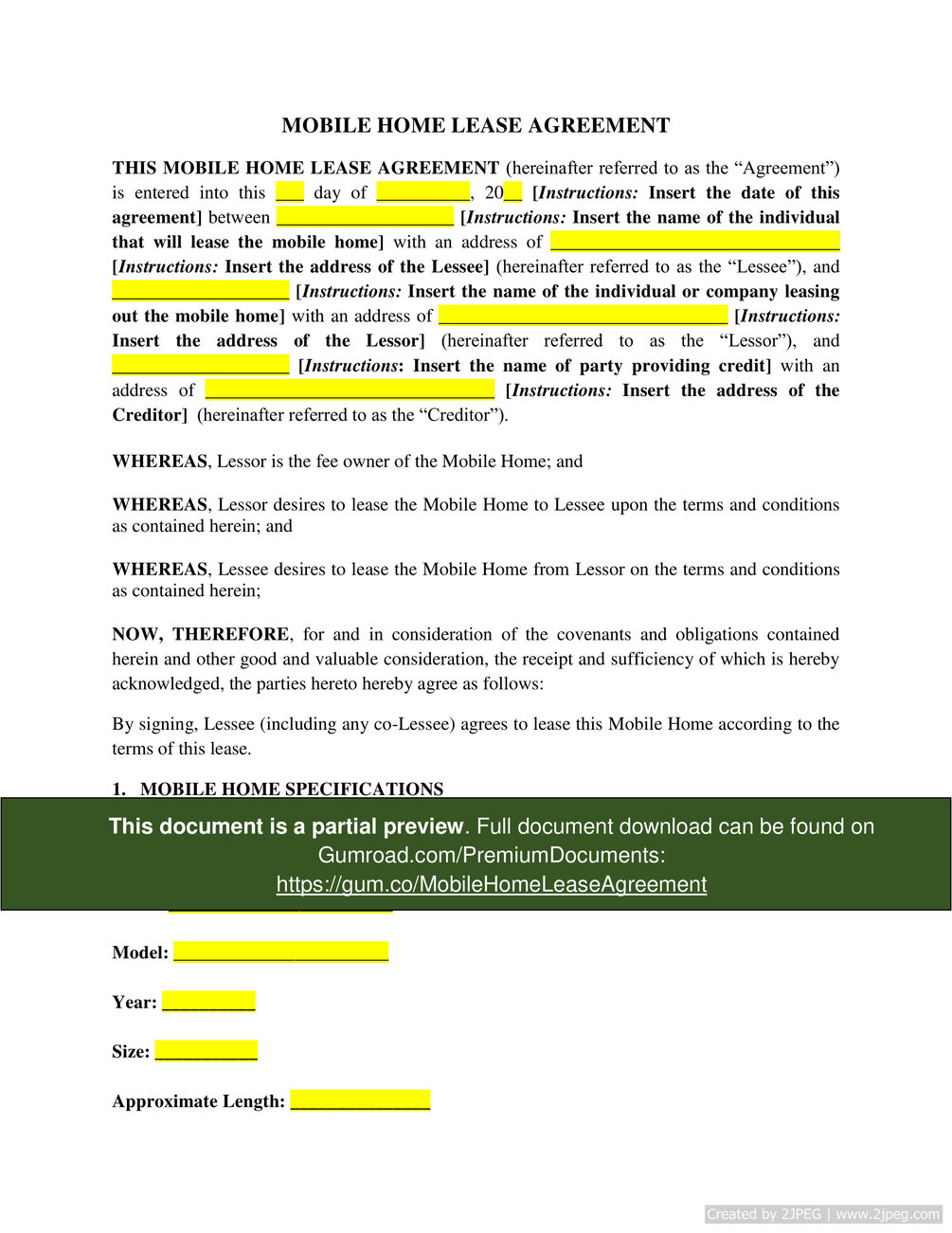 "This Mobile Home Lease Agreement can be used by a Lessor and a Lessee to lease a mobile home. Customize the mobile home's specifications, the monthly payment amount, the down payment, early lease termination fees, and much more. Lease arrangements should always use a written agreement to avoid complications and disputes between the parties. This agreement is ideal for small businesses or individuals that want to lease a mobile home.