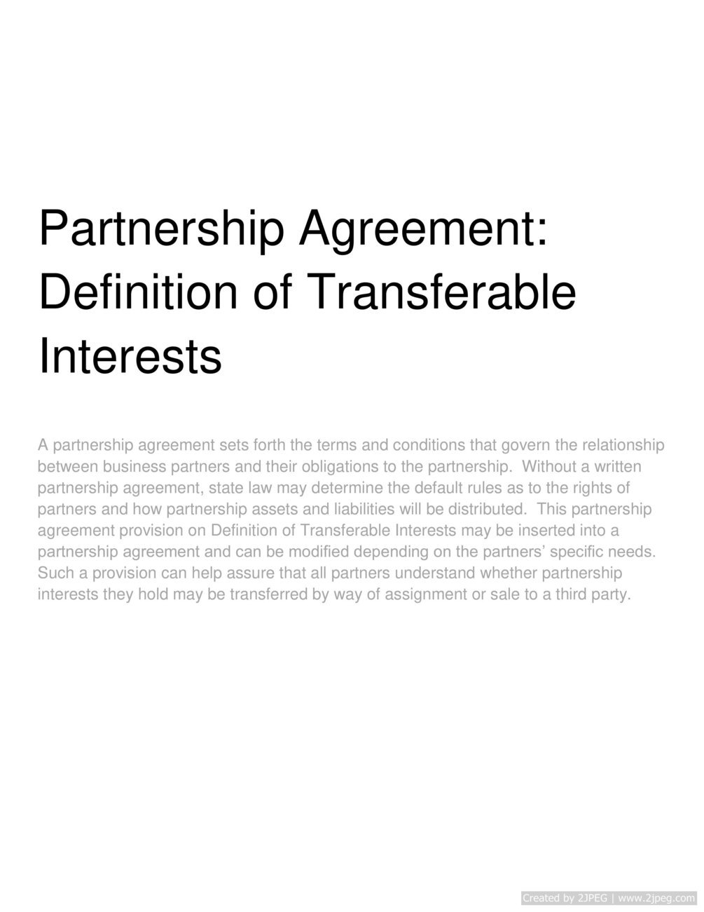 "A partnership agreement sets forth the terms and conditions that govern the relationship between business partners and their obligations to the partnership. Without a written partnership agreement, state law may determine the default rules as to the rights of partners and how partnership assets and liabilities will be distributed. This partnership agreement provision on Definition of Transferable Interests may be inserted into a partnership agreement and can be modified depending on the partners' specific needs. Such a provision can help assure that all partners understand whether partnership interests they hold may be transferred by way of assignment or sale to a third party.