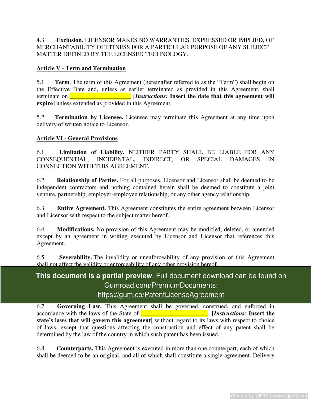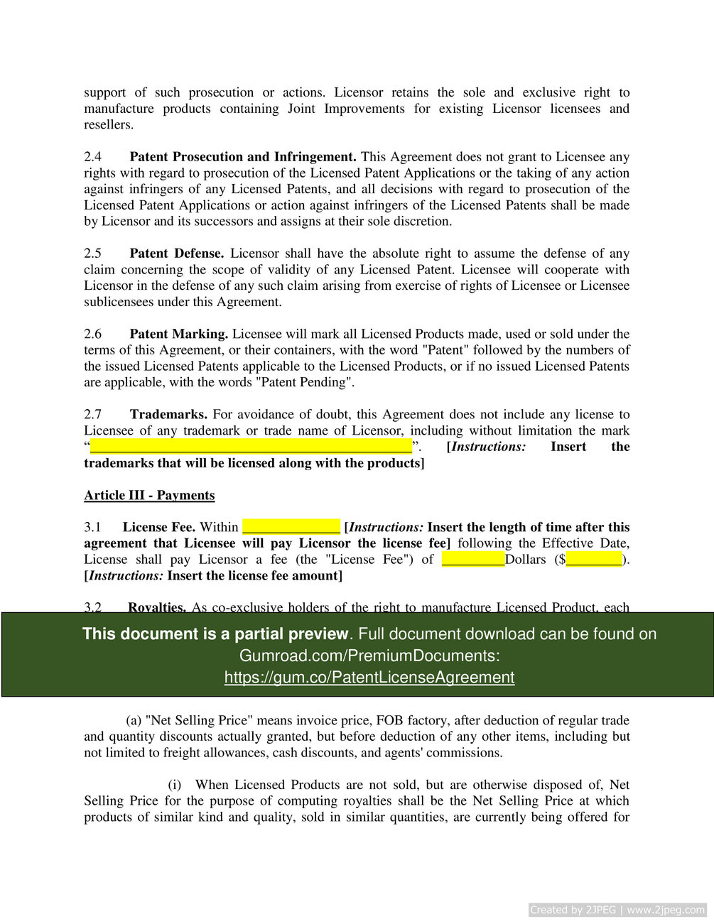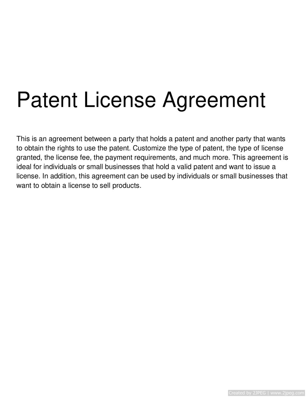 "This is an agreement between a party that holds a patent and another party that wants to obtain the rights to use the patent. Customize the type of patent, the type of license granted, the license fee, the payment requirements, and much more. This agreement is ideal for individuals or small businesses that hold a valid patent and want to issue a license. In addition, this agreement can be used by individuals or small businesses that want to obtain a license to sell products.