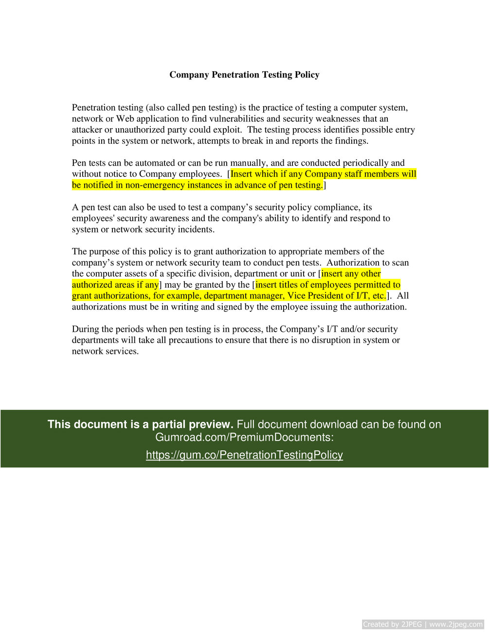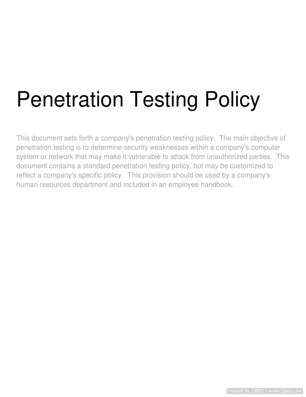 "This document sets forth a company's penetration testing policy. The main objective of penetration testing is to determine security weaknesses within a company's computer system or network that may make it vulnerable to attack from unauthorized parties. This document contains a standard penetration testing policy, but may be customized to reflect a company's specific policy. This provision should be used by a company's human resources department and included in an employee handbook.