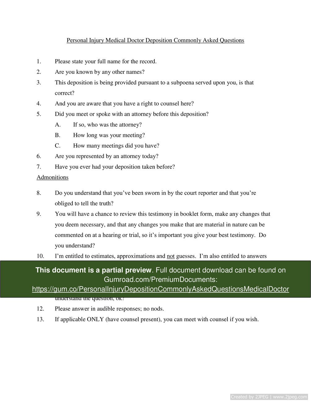"This Personal Injury Deposition Commonly Asked Questions document sets forth many of the essential questions that must be posed to a medical doctor in a personal injury case. This list provides an attorney with a solid foundation from which to conduct the deposition. Furthermore, this document ensures that crucial questions are not overlooked. An attorney should review this list before deposing a medical doctor in a personal injury case and customize it accordingly to fit the situation. This document should be used by attorneys conducting depositions or doctors before being deposed to know what to expect.