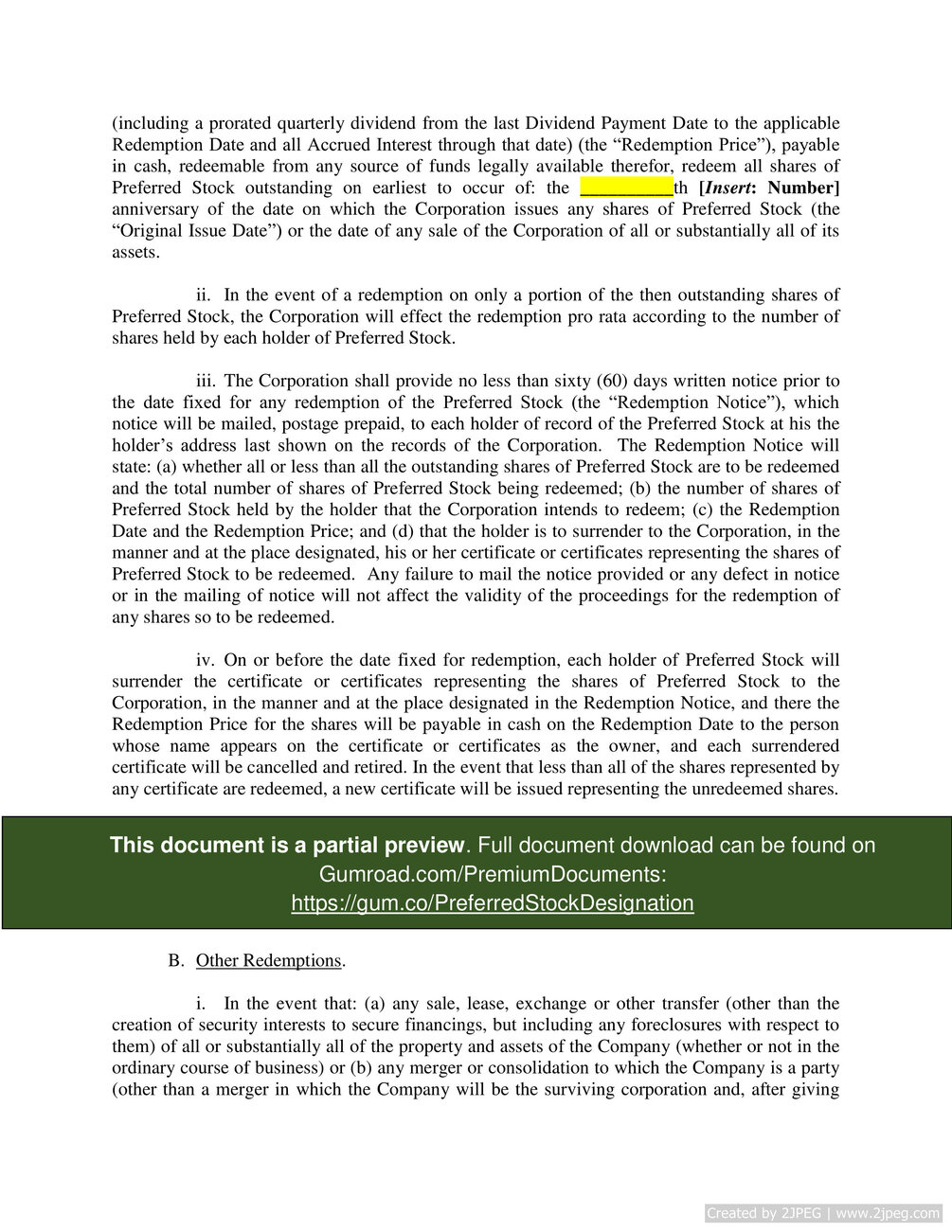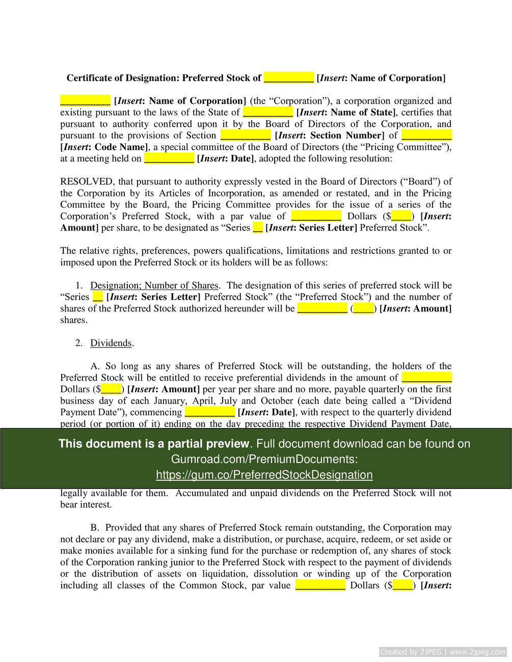 "This is a certificate of designation for a preferred stock of a corporation. This document lays out what a preferred stock is, its value, its preference (which stocks are junior and senior), the dividends it entitles its shareholder to, its voting rights, how it can be liquidated and how it can be redeemed.