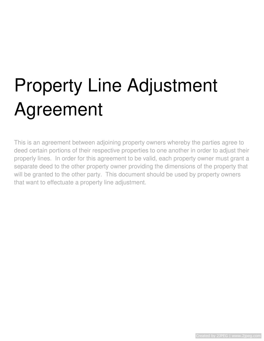 "This is an agreement between adjoining property owners whereby the parties agree to deed certain portions of their respective properties to one another in order to adjust their properly lines. In order for this agreement to be valid, each property owner must grant a separate deed to the other property owner providing the dimensions of the property that will be granted to the other party. This document should be used by property owners that want to effectuate a property line adjustment.