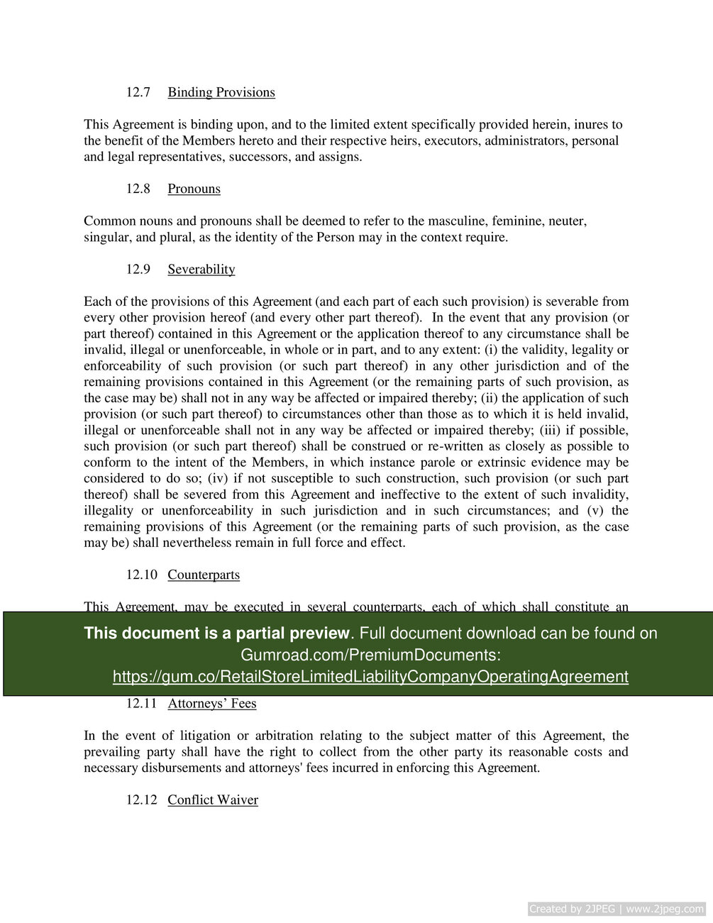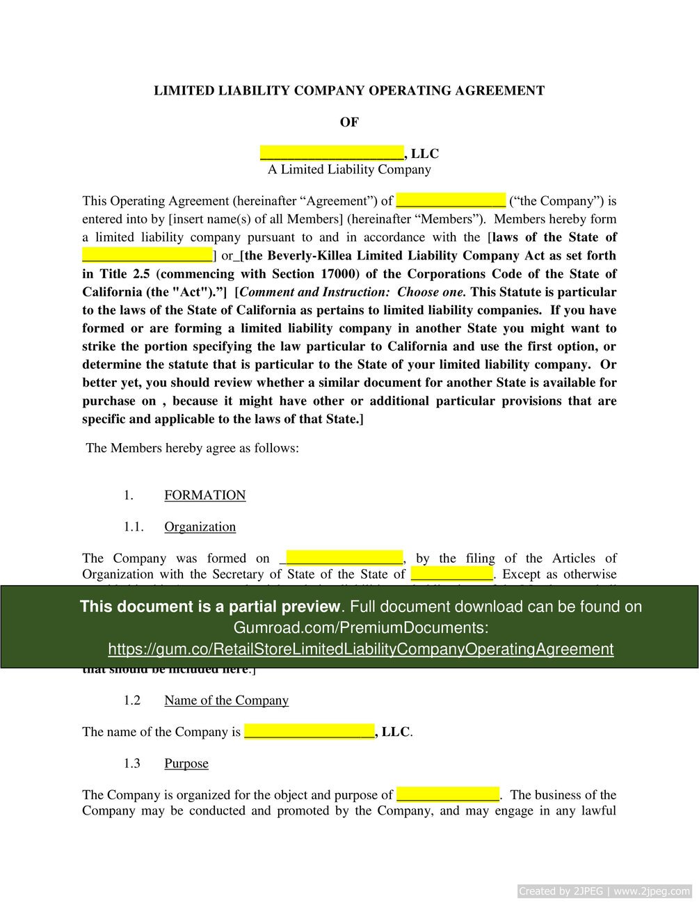 "This is a sample Limited Liability Company Operating Agreement that can be modified to fit any type of business. Limited Liability Companies ('LLC') are often the most beneficial classification for business entities because they provide for the limited liability of corporations while having the benefits of partnership taxation. In order for the LLC to be valid, it must have an operating agreement and must file the Articles of Organization with the Secretary of State. This sample operating agreement is ideal for small businesses that want to operate as an LLC.