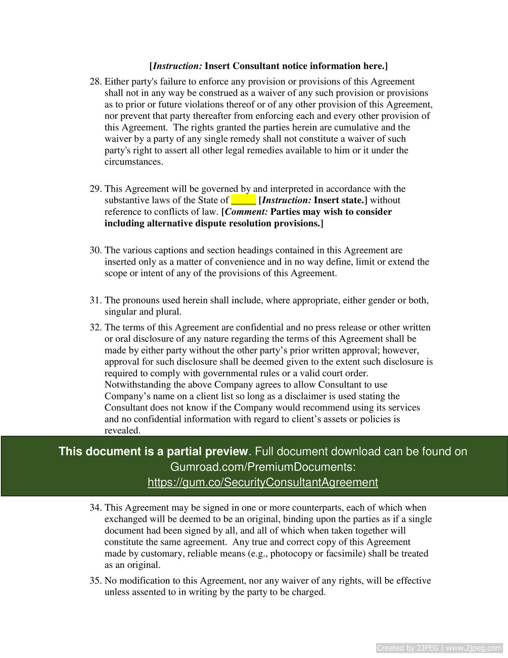 "This document sets forth a template contract that is entered into between a consultant and a company for security consultation services. This document can be customized by the parties to provide the specific security duties of the consultant, the term of the agreement, compensation rates, late fees, and travel reimbursement. This document contains numerous standard provisions that are commonly included in these types of agreements, and may be customized to fit the specific needs of the contracting parties. This document can be used by small businesses or other entities that offer security services, or by small businesses looking to hire a security services company for consultation.