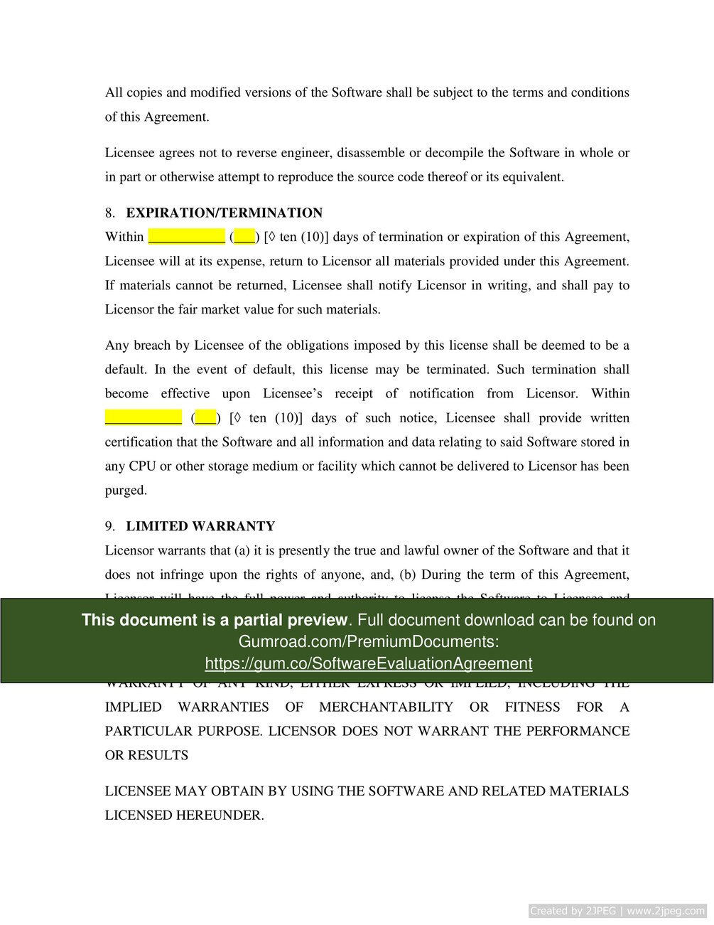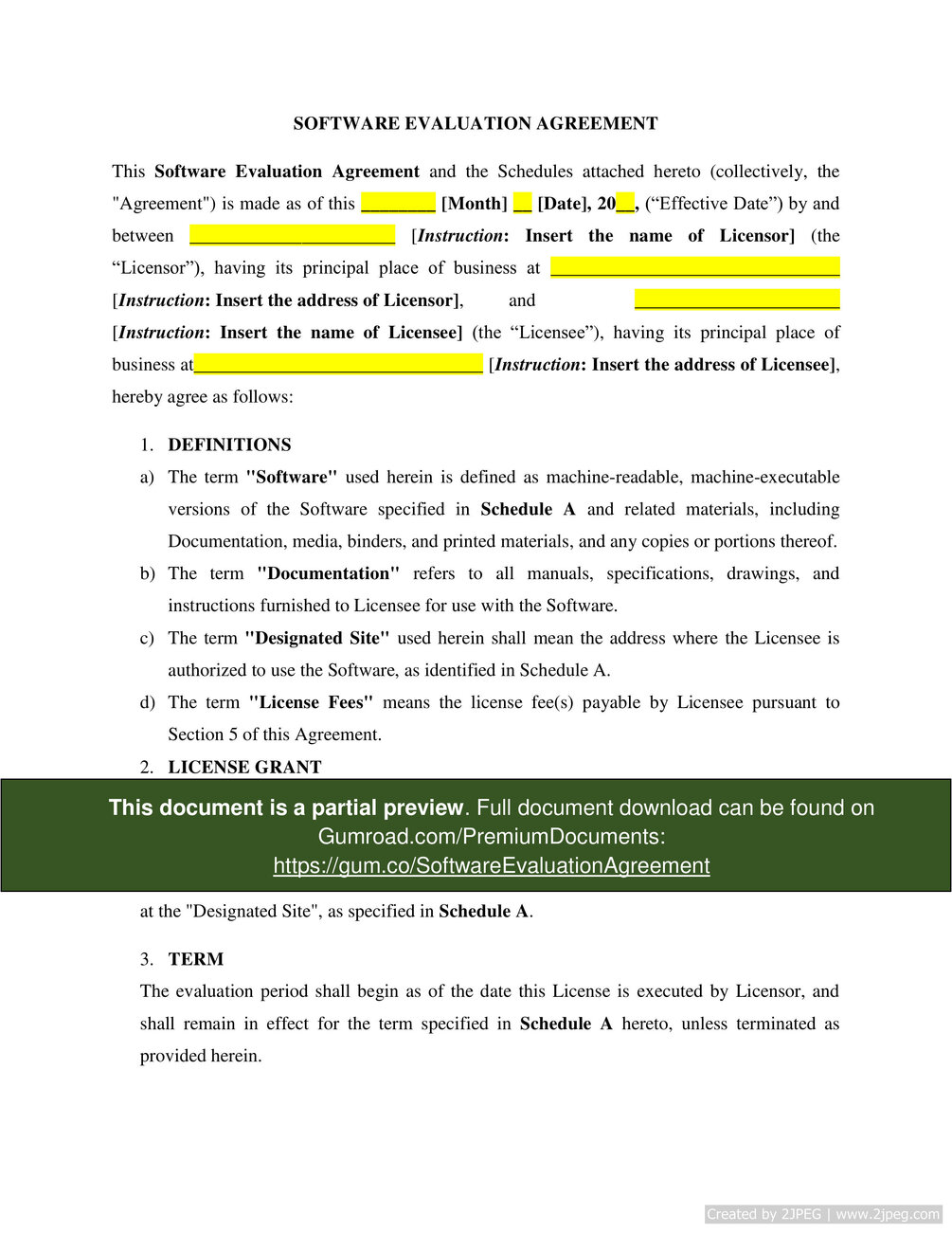 "This is an agreement whereby a software developer grants another party a personal, non-transferable license to evaluate and test software. The software developer allows the third party (the 'Licensee') to use the software to determine whether it meets the requirements of the Licensee or its customers. Additionally, this agreement includes a fully customizable 'Schedule A' where the parties provide the name and a brief description of the software. This agreement can be used by small businesses or other entities that develop software and want to grant their potential consumers a provisional license to use and evaluate the software.