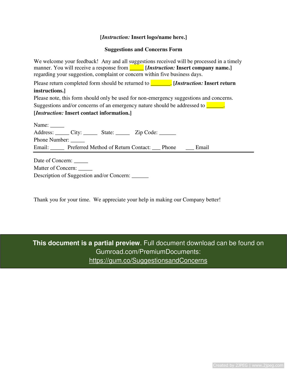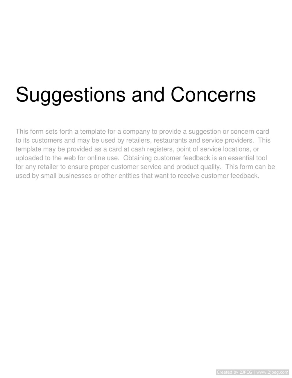"This form sets forth a template for a company to provide a suggestion or concern card to its customers and may be used by retailers, restaurants and service providers. This template may be provided as a card at cash registers, point of service locations, or uploaded to the web for online use. Obtaining customer feedback is an essential tool for any retailer to ensure proper customer service and product quality. This form can be used by small businesses or other entities that want to receive customer feedback.