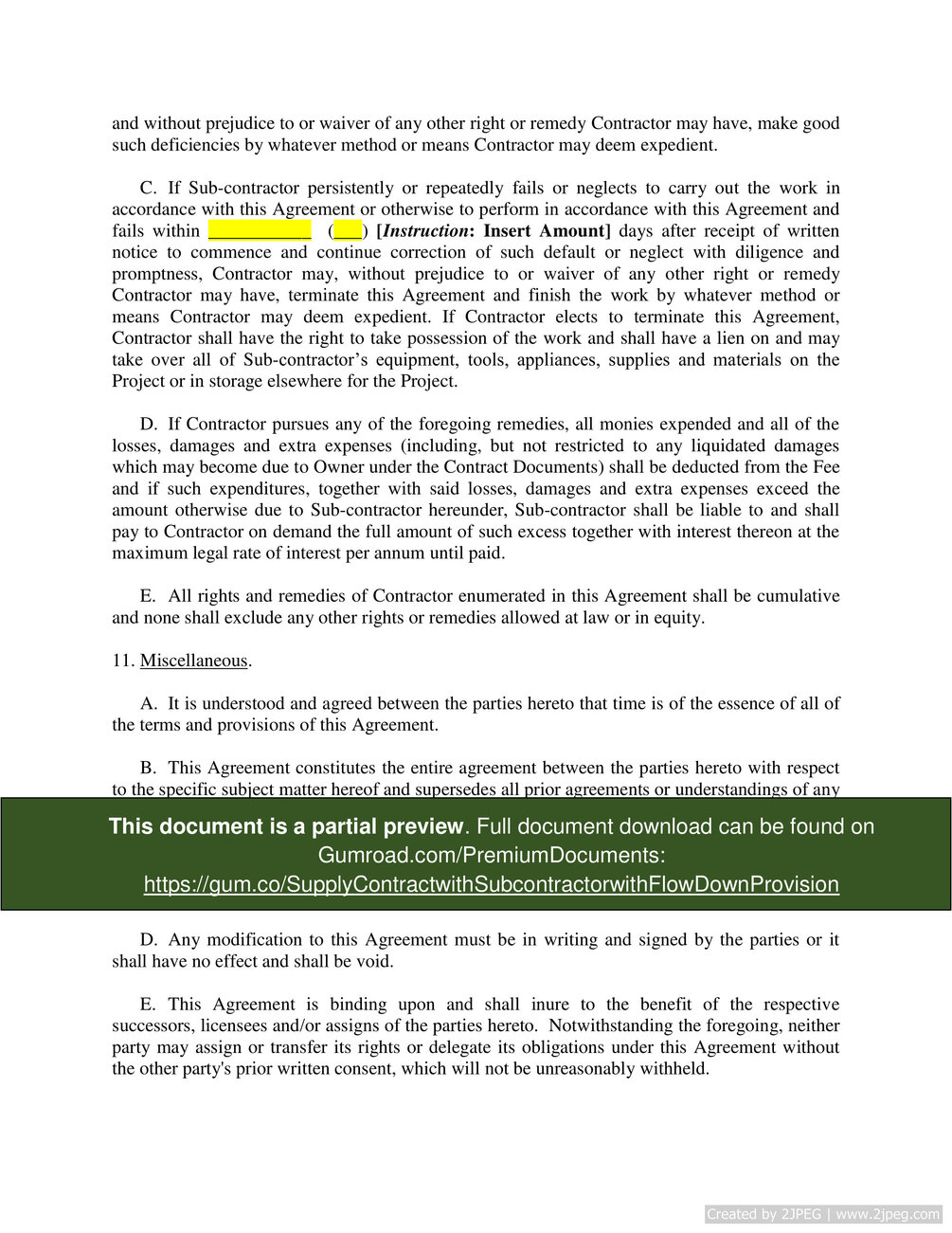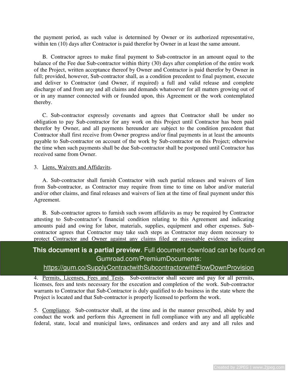 "This is an agreement between a contractor and a sub-contractor requiring the sub-contractor to provide all of the materials, supplies and equipment for a construction project. The agreement includes a flow down provision, which means that the terms of the general contract between the owner and the contractor flow down into this sub-contractor agreement, therefore the sub-contractor is essentially responsible for the contractor's responsibilities to the owner. This agreement can be used by small businesses that offer contracting services and want to engage a sub-contractor to provide supplies for a construction project.